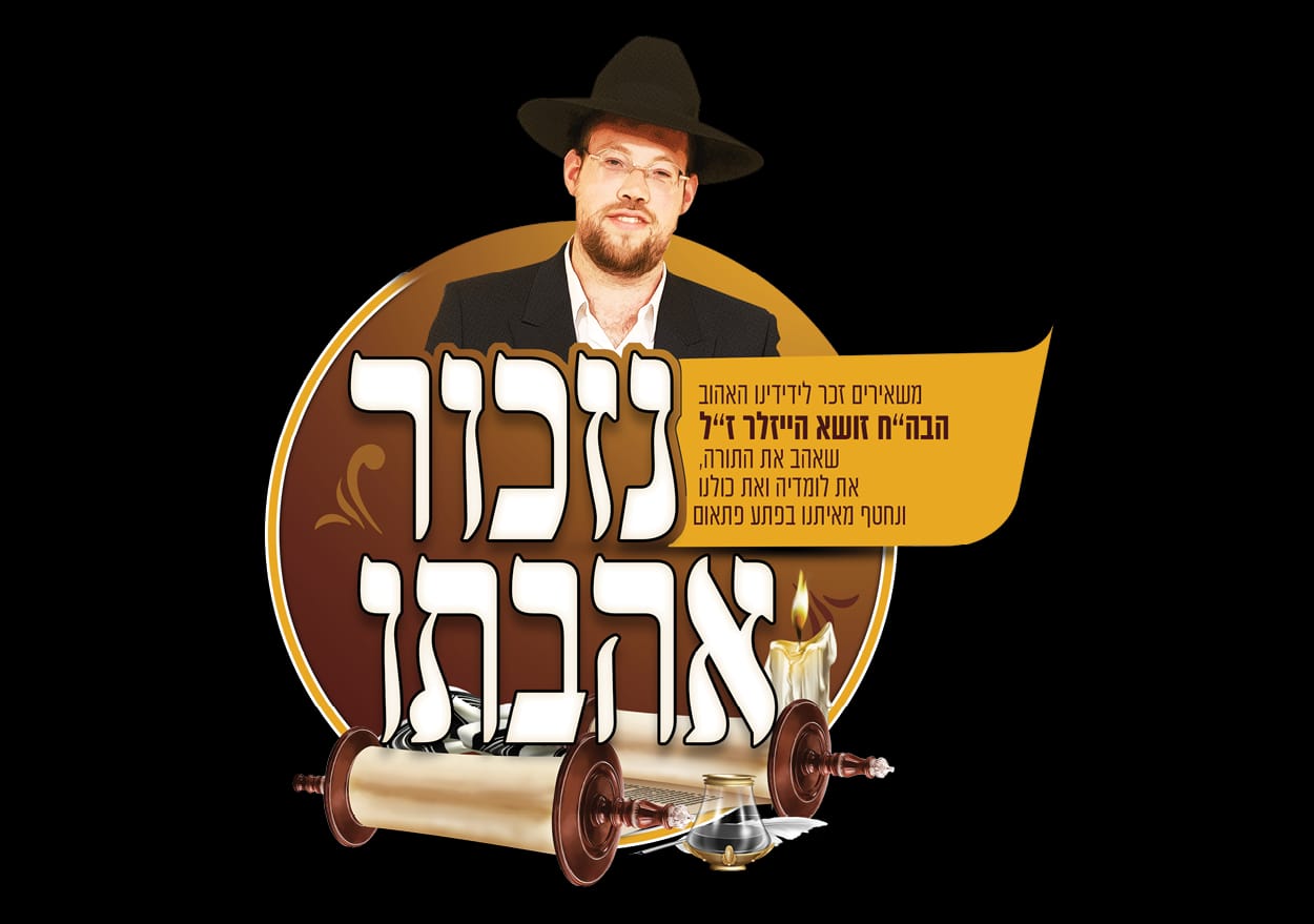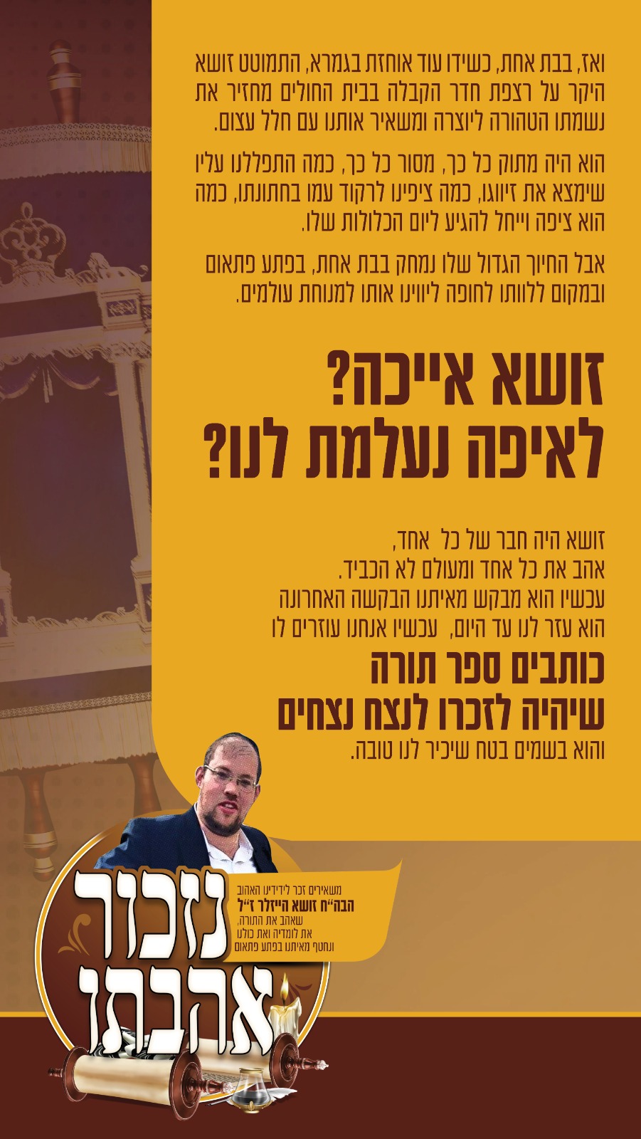 | הם עמדו שם במאותיהם, ממלאים את הסמטה של רחוב שמגר, הלב מסרב להאמין, לעכל, להכיל. זושא הייזלר האהוב איננו. לא היה אחד ממכריו הרבים שלא אהב אותו. לא היה אחד שלא נעזר בו, וכולם ידעו ששאיפת חייו הייתה להתחתן, להקים בית נאמן של תורה, להביא ילדים כמו שהחברים שלו זכו אבל זושא לעולם כבר לא יתחתן.הוא איננו, כי לקח אותו האלוקים בפתע. זושא תמיד למד, בכל מצב ובכל זמן, וכעת הספר תורה שאנחנו נכתוב יהיה לעילוי נשמתו הדבר היחיד שנותר לנו לעשות כדי שישאר ממנו זכר הוא להיות שותף בכתיבת ספר התורה לעילוי נשמתו, והוא בוודאי כמו תמיד יכיר לנו טובה על כך |