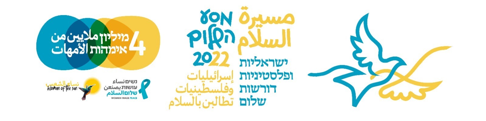 | | 29.9 + 2.10 סדנא מפגשים בבית ג'אלה וחברון - אישה לאישה - ישראליות ופלסטיניות בונות עתיד الخليل، بيت جالا – المرأة للمرأة – إسرائيليات وفلسطينيات نبني المستقبل 7.10 תקוע - אישה אל אחותה - מדברות שלום تقوع – المرأة لأختها – نتحدث السلام 11.10 מייסר - השקת הפרוייקט הארצי "יד לשלום" לקידום תודעת שלום ושכנות טובה ميتسر – ميسر – تدشين المشروع القُطري "يد للسلام" من أجل تعزيز وعي السلام والجيرة الحسنة 12.10 עוטף עזה - מתי יימסו חומות הפחד - יום במרחב העוטף, מפגשים ועצרת אל מול החומה غلاف غزة – متى تذوب أسوار الخوف – يوم في المنطقة الغلافية، لقاءات ووقفة أمام الجدار 13.10 אירוע שיא ירושלים - בית ג'אלה - כנס "קריאת האמהות" - ישראליות, פלסטיניות ונשות העולם - הקול הנשי, התרבותי הדתי והפוליטי בפתרון סכסוכים بيت جالا – مؤتمر: "نداء الأمهات". إسرائيليات وفلسطينيات ونساء العالم – الصوت النسائي، الحضاري، الديني والسياسي في حل الصراعات 14.10 ירושלים ורמאללה - מביאות את "קריאת האמהות" לנשיאים יالقدس – رام الله – نوصل "نداء الأمهات" إلى الرؤساء. פרטים מתעדכנים והרשמה כאן | | אישה עושה שלום – לזכרה של כוכב (כוכי) עם-עד ז"ל ( 1953- 2022) امرأة تصنع السلام - لذكرى كوخاف (كوخي) عم-عاد رحمها الله