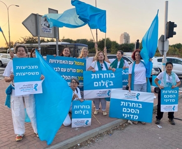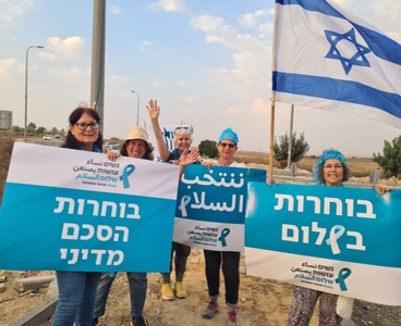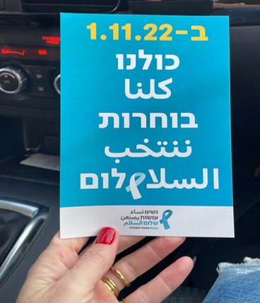 | חברות נשים עושות שלום יצאו לגשרים ולצמתים בקריאה לצאת ולהצביע, ולבחור במפלגה שפועלת לקידום הסכם מדיני ומשתפת נשים. בוחרות בשלום! מצביעות - משפיעות! |