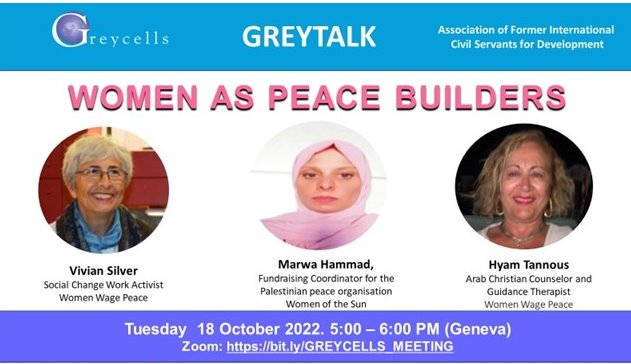 | נציגות התנועה ויויאן סילבר והיאם טאנוס, יחד עם מרווא חמד מנשות השמש, סיפרו על התנועות, על השותפות, על הכוח ועל תפקיד הנשים בקידום שלום, במפגש זום עם חברי אירגון Greycells, פורשי ארגונים בינלאומיים לנושאי פיתוח. את המפגש ארגנה אסתר גולומה, תומכת התנועה, שעבדה בעבר באו״ם, והזמינה לזום גם קולגות שלה שעבדו באו״ם בעבר. |