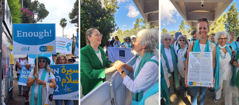 | מסע השלום, שהחל במחצית ספטמבר ועבר בנקודות רבות בארץ, הסתיים בחול המועד סוכות בירושלים. כמאה נשים נחושות וגם כמה גברים הגיעו לבית הנשיא במסגרת סוכת השלום המסורתית, שאליה מזמין נשיא המדינה מידי שנה בסוכות את כל תושבי ישראל. נשות התנועה הגישו לו ולרעייתו מיכל את קריאת האימהות, המשותפת לאימהות ישראליות ופלסטיניות, והשמיעו אמירה ברורה: הגיע הזמן להוביל לסיום הסכסוך! פעילות התנועה המשיכו בצעדה לכיוון כיכר פריז, שם ערכו כינוס וחזרו על הדרישה להפסיק את מעגל הדמים האיום. די!! ביכאפי! ENOUGH! כתבה מפורטת כאן |