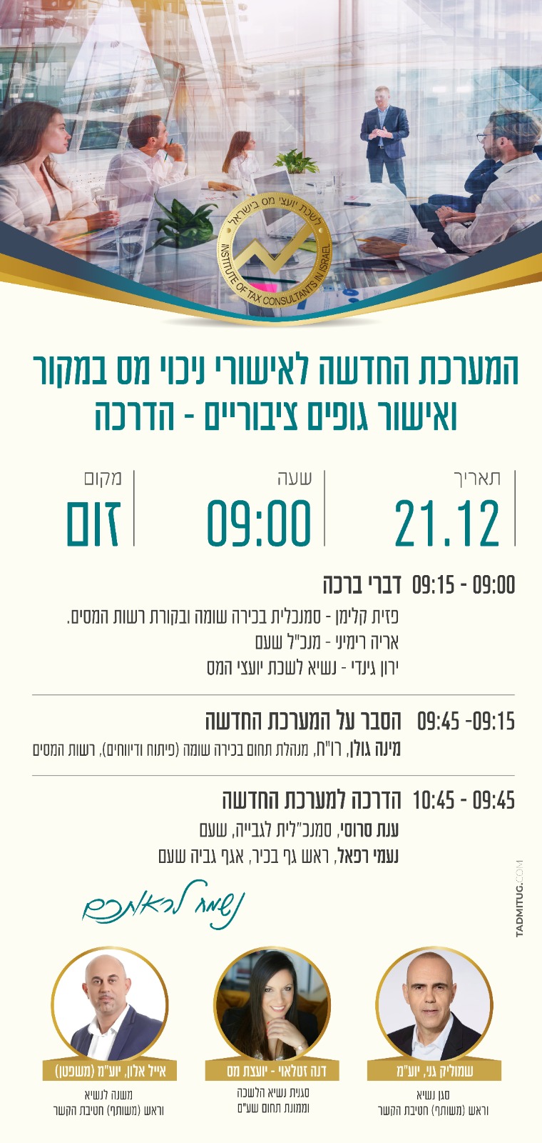 מצ"ב הזמנה להשתלמות מקוונת בנושא המערכת החדשה לאישורי ניכוי מס במקור ואישור גופים ציבוריים, כל הפרטים בהזמנה המצורפת.