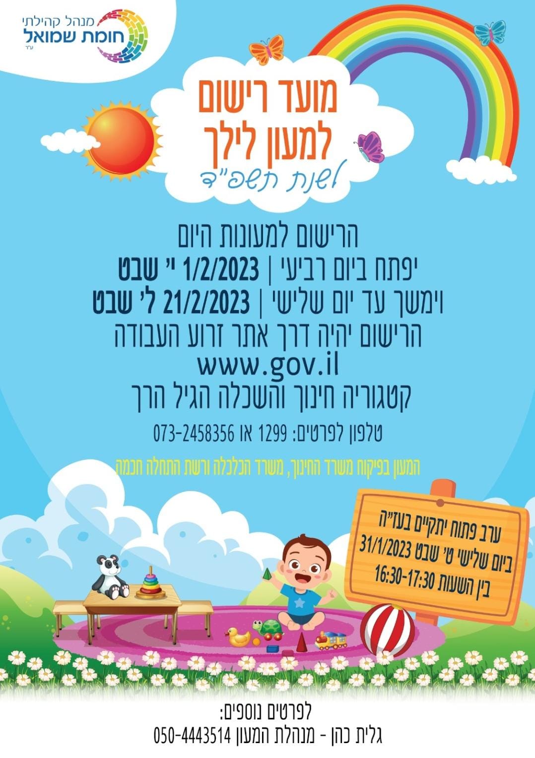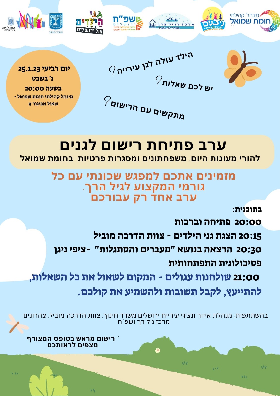 | ערב פתיחת רישום לגני הילדים. ️ערב שכונתי להורי חומת שמואל 25.1.23 יום רביעי במינהל הקהילתי - שאול אביגור 9. יש לכם שאלה? רוצים לדבר עם מנהלת האיזור לגבי הרישום? רוצים לשמוע ולשאול על גן מסויים? רוצים לשמוע הרצאה מרתקת על המעברים וכיצד להקל על ילדכם בהסתגלות?