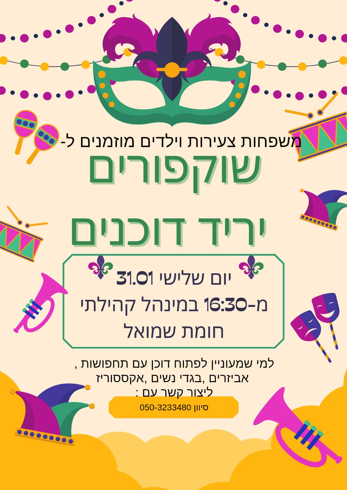 | ביום שלישי 31/1 מהשעה 16:30 יתקיים שוק פורים במינהל הקהילתי. בואו להנות ממגוון דוכנים ולהיכנס לאווירת פורים. למעוניינים בפתיחת דוכן צרו קשר עם סיוון- 0503233480. האירוע הוא בשיתוף עם רכזת הקליטה של העולים-תהילה, והיא תהיה נוכחת באירוע. |