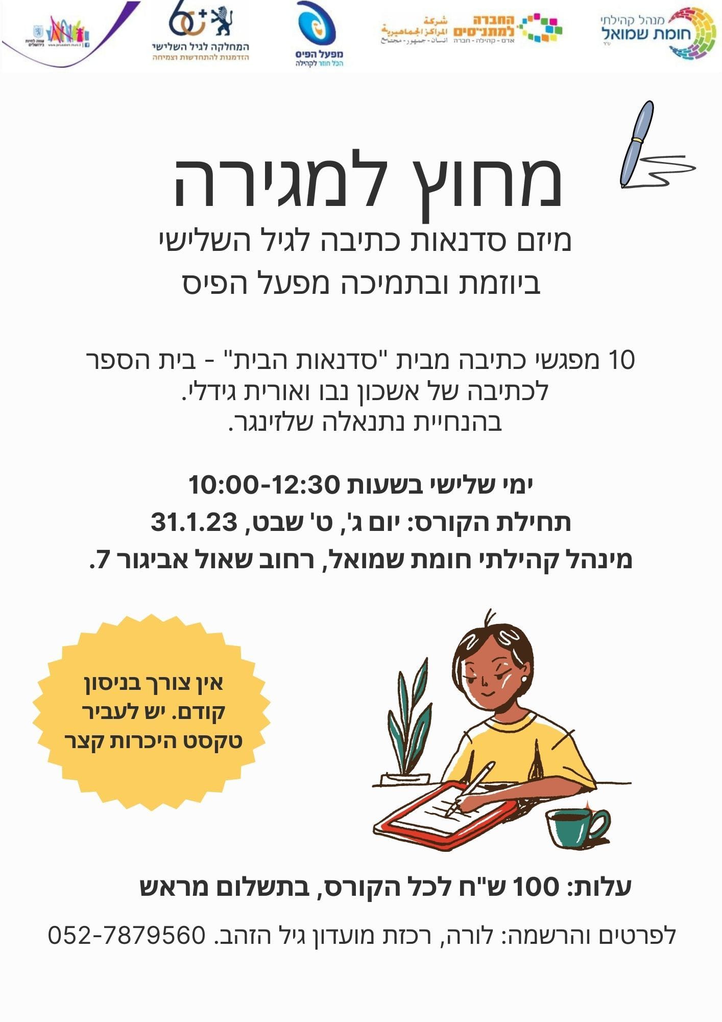 | מחוץ למגירה- מיזם סדנאות כתיבה לגיל השלישי! מוזמנים להצטרף ל10 מפגשי כתיבה חוויתיים מבית ''סדנאות הבית''. עלות 100 ש''ח לכל הקורס בתשלום מראש. לפרטים נוספים והרשמה- לורה- 0527879560 |