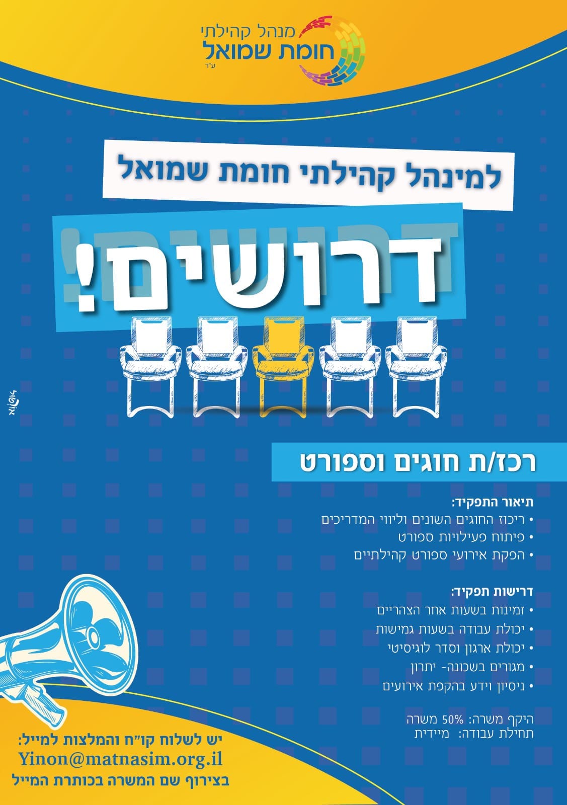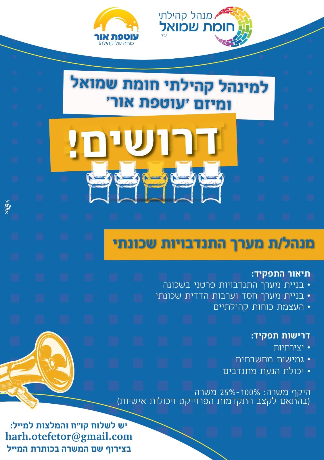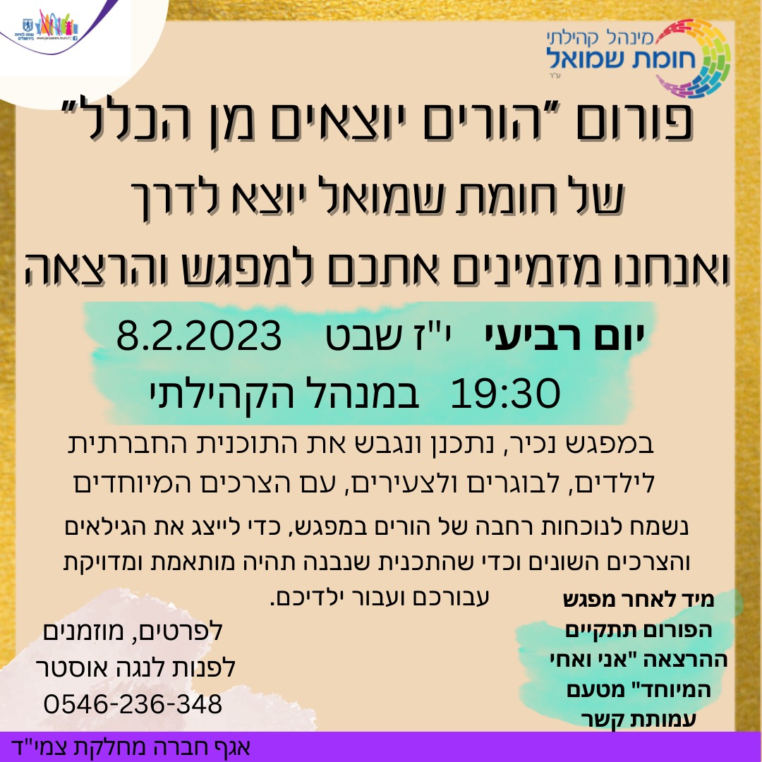 | נשמח לקיים פורום צמי"ד ביום רביעי, י"ז שבט ה8.2 בשעה 19:30 ומיד לאחריו הרצאה בנושא אחאות מיוחדת. בפורום נדון בנושא החוגים, צרכי הקהילה והשכונה והתכנית השנתית. מוזמנים להירשם בקישור: https://forms.gle/mbHgM9oUKKhf3zKg9 |