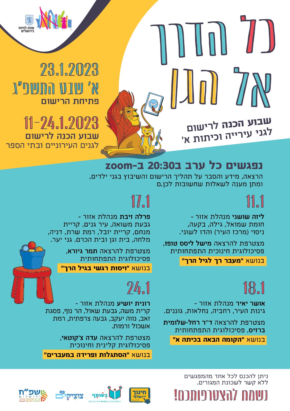 | כל הדרך אל הגן- שבוע הכנה לרישום לגני עירייה וכיתה א'. נפגשים כל ערב ב20:30 בZOOM. הרצאה, מידע והסבר על תהליך הרישום והשיבוץ בני ילדים, ומתן מענה לשאלות שחשובות לכן.ם. בתאריכים:11-24.01.2023 |
