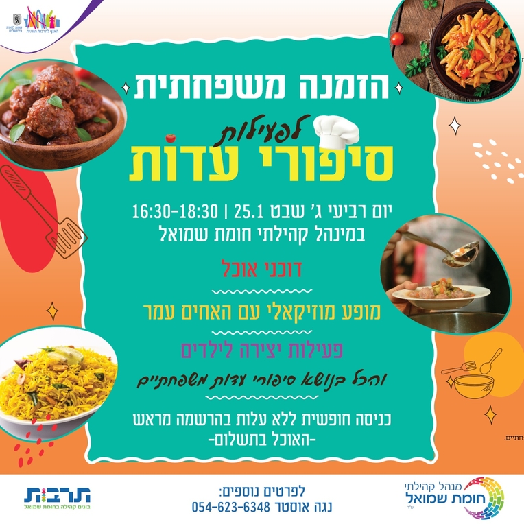 | משפחות חומת שמואל מוזמנות לאחר צהריים טעים ומעשיר עם דוכני אוכל, מוזיקה טובה ופעילות יצירה לילדים ביום רביעי ג שבט, 25.1 בשעה 16:30-18:30. הכניסה חופשית בהרשמה מראש: https://forms.gle/Ynr6mU2Cg9SCU2js7 לפרטים: נגה 0546-236-348 האירוע הוא בשיתוף עם רכזת הקליטה של העולים- תהילה, וזאת אחת מהפעילויות שיחכו לכם. עולה מצרפת תלמד אתכם איך להכין סיגר עם שקדים! אמהות וסבתות מדרום אפריקה אוהבות לפנק את המשפחה , במיוחד בחגים ובשמחות הן מכינות מאכלים טעימים. אתם מכירים את הקינוח הכי מרשים שלהן ? סיגרים ממולאים בשקדים טחונים מטוגנים עם סירופ של דבש מבחוץ… ריח וטעם של גן עדן! |