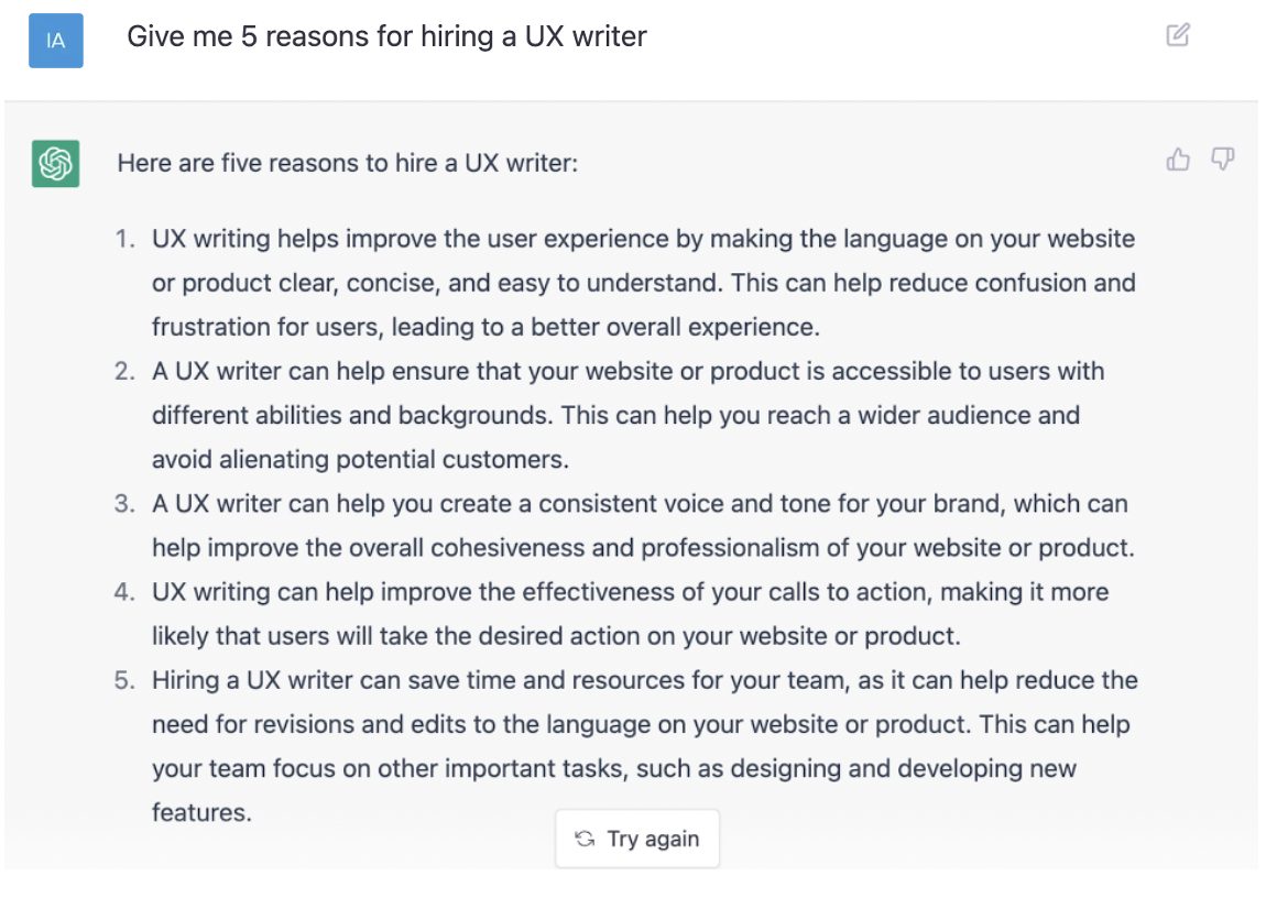ומה אצלנו? סתיו מורן לשם העלתה בקבוצה צילומסך שבו שאלה את הצ'אט למה כדאי לשכור UX Writer. הוא נתן לה סיבות מצוינות, מנוסחות היטב כמובן: