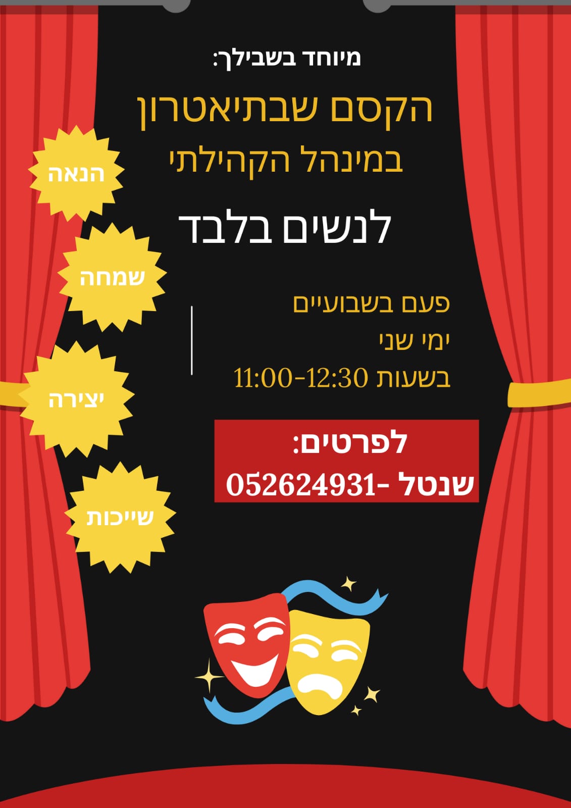 | נשות הגיל השלישי מוזמנות להירשם ל''קסם שבתאיטרון'', חוג תיאטרון במינהל, שמתקיים בפעם בשבועיים בימי שני בין השעות 11-12:30. לפרטים- שנטל:052624931. |
