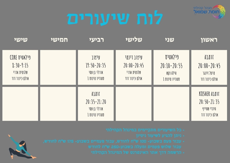 | נשים יקרות, במינהל מתקיימים מידי שבוע מגוון חוגי ספורט, מוזמנות להצטרף! להנות מרגע שהוא רק עבורכן ועבור הגוף שלכן,להשתחרר מהלחצים ומהשיגרה. ניתן להגיע לשיעור ניסיון. הרישום לחוגים מתבצע דרך האתר של המינהל- https://homat-shmuel.co.il/ מחכות לכן |