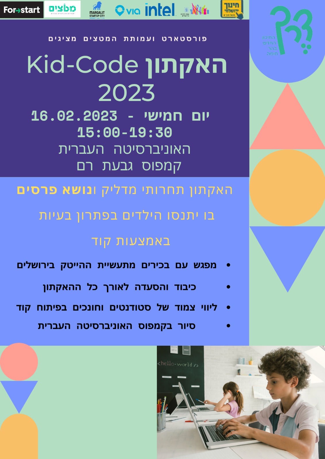| בשבוע הבא יתכנסו 70 ילדים ובני נוער מהשכונה באוניברסיטה העברית לתחרות תכנות מטורפת. ואיך זה התחיל? לפני שנתיים יצא תיכון דרך עם תוכנית המט״צים - מובילים טכנולוגיים צעירים. תוכנית שנבנתה בפרויקט ייחודי יחד עם בכירים מIntel ישראל ועמותת פורסטראט. ובשבוע הבא זה קורה פעם שניה - האקתון ילדים בו יקחו חלק עשרות ילדים מהשכונה, מבתי הספר המעולים שלנו. שהטובים והטובות ביותר ינצחו, מה שבטוח - השכונה כבר זכתה!