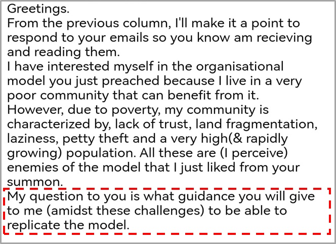 | If the subject of rural communities’ structure and organization excites you as it excites me, here are simple steps to move forward. Step 1 – Act. Wait for no one! Remember the gym story; anything is better than doing nothing. A journey starts with a small first step. Step 2 – Set goals. Firstly, ask yourself, “What is my ultimate goal? Is it limited to impact a certain community or to set a model and an example for others to follow?” Step 3– Quick wins. Line up “achievable intermediate targets” and pursue those on your way to achieve “the ultimate goal." BE REALISTIC Suppose you plan to launch a socio-economic entrepreneurial project on transforming rural communities. In that case, you should not fear nor underestimate the task, its complexity, and its challenges. Just be realistic and, accordingly, set your targets and goals. Here is my advice as to the first meaningful step - LOCAL - For those wishing to impact a specific community. Focus on preparing a complete plan you will design with the community members. Design it based on small steps toward the goal set by the community! REMEMBER - begin the execution only when the community agrees on the program’s goal and targets. NATIONAL MODEL – For those wishing to present a model which will later be copy-paste to other communities (as was the case in Israel). Know that by succeeding, you will bring prosperity to millions. However, if you fail, you risk that people will say this path is no good and refuse to experiment with it again. So be prepared, leave no place for failure, and ensure success. Anything less than success would be a failure. Aiming to present "A Successful Model," your target should be to create a detailed outline of the infrastructure required for such a project. Among others, the infrastructure for such a national project will include – •Public relations (PR): enlisting the support of leaders and decision-makers at all levels: national, regional, and agricultural communities. • Secured budget (Finance): to finance all stages. • Human Resource (HR): people - management and experts. • Work plan: GANTT, activities, and targets. ========================== To get a PDF document with the outline of a detailed plan, email me (or reply) to nisraely@biofeed.co.il - “From Poor Individuals To Thriving Cooperative Agro-Communities: Outline For A Transformation Plan.” Feel free to add a few words describing your project. ========================== PRACTICE You don’t learn swimming by corresponding with the trainer, reading, or talking with someone who heard of it. The same applies when we wish to transform communities’ lifestyles. Yes, a higher level of sharing and community result-oriented operational organization is the secret to prosperity among impoverished smallholder communities. Yet, knowing this from first-hand experience, that of my parents, who established a Kibbutz, and myself taking part in establishing another one, is paramount when trying to apply the same concept elsewhere. Though it may look easy, such transformation is more challenging than one can imagine. Talking, explaining, teaching and theoretical presentations are needed and helpful. However, you don't make such a transition using those tools but by practicing it with the community members and, even better, with the support of people who did it. Hence, if your goal is to act hand in hand together with me to establish a working model in your country, you should think big (no, much bigger!!), and we will act to realize it. Once you know what you want, you have a plan and potential financial resources, contact me, and the rest will follow. REDESIGN THE AGRICULTURAL PACKAGE Keep in mind – a thriving agro sector stands on three pillars: (1) Ecosystems, (2) Business Models, and (3) Technologies/Services We refer to the combined three pillars as The Agricultural Package. By transforming a rural community from “individual-based” to “cooperation-based,” we redesign The Agricultural Package. There is no reason for you to face those tremendous challenges alone. Like smallholders, your chances to succeed while working alone are low and increase when you cooperate. Below are three ways to receive support, guidance, and in-field assistance for a community transformation project. OPTION 1: To educate yourself, attend the 2024 International Conference On Business Models In Agriculture (IBMA 2024), where the 2024 theme is “From Solitary Poor Individuals To Organized-Prosperous Communities.” OPTION 2: Regarding a (funded) national model project, you can contact me to work together. OPTION 3: The Dream Valley Package model contains parts of the cooperating community model (Kibbutz style, tailor-made per case). It can be the first step in a long-term transition program we will build together. Remember, * We do not wish to copy a lifestyle, e.g., Kibbutz or Moshav, but the PRINCIPLES that made it successful. ** It's never too late or little to do the right thing, and no excuse justifies doing nothing. TAKEAWAY MESSAGE » ACT - it is better to do little and slowly than nothing. » DEFINE WELL what you want; “a community transformation project” or “a national model,” and set your goals accordingly. » SET YOURSELF up for success by organizing a "winning team" and a budget to match the goals. |
