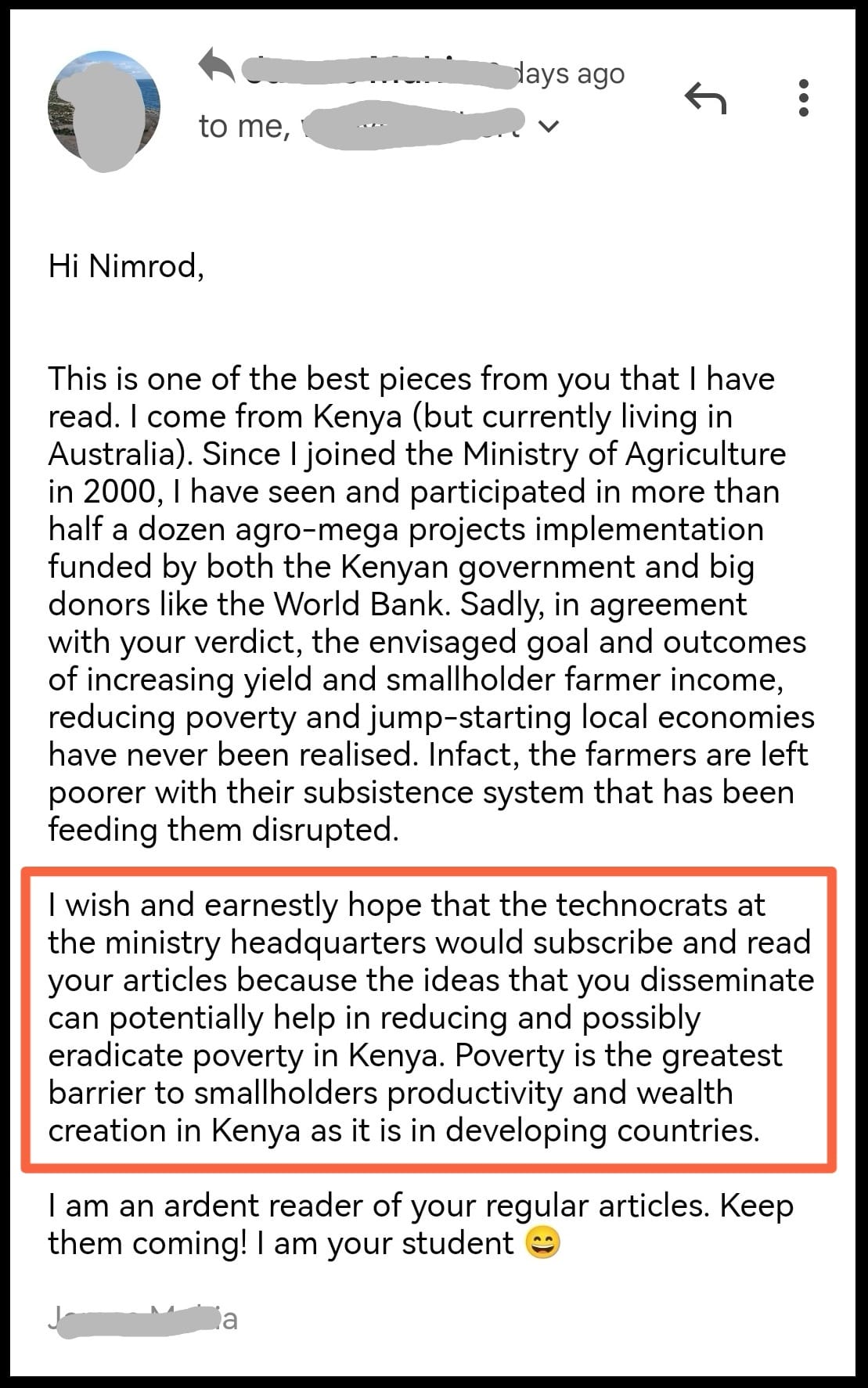 | WHY THINGS ARE BETTER THAN EVER? Based on human evolution and history, I know the agro sector in developing economies has left little place for trust, and the fear of risking and losing their little is the primary motivation source. I have no illusions or expectations for a fast change in the agro sector of developing economies, mainly because the national level is not ready yet. My expectations are low from experts, stakeholders, decision-makers, investors, and businesspeople to swiftly adopt a novel concept different from the one they know and use. Studies show that experts are the late adopters of new concepts utterly different from what they are experts in. However, my expectations are high from the non-biased public and the non-experts. They are free of prejudice or conflict of interests; when something makes sense, they realize it. Why things are better than ever? Things are always in their worst state when you are heading in the wrong direction, confident that the solution is over the corner. Well, that is about to change. We are now at a turning point, understanding we went the wrong way realizing we have been wasting $ billions for decades, achieving nothing other than increased mistrust and frustrated poorer farmers. However, we are blessed for finding "the path to prosperity.” Our situation was never better, for we finally acknowledged we were wrong, and it seems we have a safe path to prosperity. SUCCESS!? If you are looking for hundreds of millions of smallholders that will overnight shift from poverty to become part of the middle class, this is not the “success” I refer to, though this would come too, in time. In the case of the #1 UN SDG, poverty, “success” is more subtle. “Success” resembles more the change of mind, the opening of eyes to a possibly different and better future, like I had when using pheromones and realizing sprays are not a necessity; we can do without them, and we can do better. “Success” is when one is more open to hearing, learning, and implementing innovative concepts that are not more of the same, “I will study and meditate on… My bones tell me this is true.” “Success” is when someone highly experienced says, “I wish and earnestly hope that the technocrats at the ministry headquarters would subscribe and read your articles because the ideas that you disseminate can potentially help in reducing and possibly eradicating poverty in Kenya. Poverty is the greatest barrier to smallholders productivity and wealth creation in Kenya as it is in developing countries.” “Success” is when you establish a conference, like the IBMA, that defies the “accepted” approach that reduces the challenge of poverty among smallholders to technologies, funds, and capacity building (whatever that means), and now is celebrating its second event. “Success” is those little things, vibrations that signal that things are not as always; something changes underneath the surface. “Success” begins with one person who changes his attitude, and we now have thousands. The boat began moving; peoples' minds are open, and the social and business environment was more positive and ready for novel concepts than ever. When we detect those vibrations, we can be sure the earthquake will follow, though we can't know the exact time. I am optimistic about the future of smallholders in developing economies because, for the first time – • We know that smallholders’ poverty is unrelated to – technologies and funds. • We understand the foundation for a healthy agro sector is its three pillars: the Package - ecosystems, business models, and technologies/services. • We have documented success stories when applying the three pillars correctly to the poor Israeli farmers (1900 – 2000) and recently with the mango small-hold growers of Senegal. • When the Package is appropriately designed and applied, improvement (change) is immediate, enormous, and unmistakable. • We have the trust of big organizations/governments that support the International Conference on Business Models In Agriculture (IBMA) and the belief of action people active in Africa. • There is a tremendous public interest, as reflected on social networks, particularly LinkedIn (40K followers). • We have experts who understand that the barrier to advancing smallholders is not in more tech or funds but the knowledge that decision-makers should acquire - “I wish and earnestly hope that the technocrats at the ministry headquarters would subscribe and read your articles…“ • As reflected by big food chains/supermarkets, consumers are looking forward to this change. We were blind, and now we see. We were deaf; now we hear. We were silent; now we talk. We were disabled, and we began walking. At first, it looks as if there is no change, then you hear something, and then another something, and before you know it, everything is changed. This was the case in the Amazon commerce revolution, the social networks revolution, the smartphone (iPhone) revolution, and the A.I. revolution led by Chat GPT. This will be the case with the small-hold farmers’ prosperity revolution led by Dream Valley. Do you see the better future as clear as I do? Be patient, act, and do the right things; you shall receive your return in time. Take your time. I once saw how smells, e.g., pheromones, which I couldn’t see, replace toxic sprays in protecting our produce. It instilled in me the faith in the power of vision and the ability to reach what your vision desires. What does your vision desire? What do you do to achieve it? Want to change the rural community's development trajectory in your country or elsewhere? Are you unsatisfied with a running rural project or want to plan a new one? Message me +972-54-2523425 Whether you agree or not, share your thoughts with me. TAKEAWAY MESSAGES » LOOK TO CHANGE what others don’t even consider as “changeable.” » WE ARE encouraged to avoid risk, e.g., chang