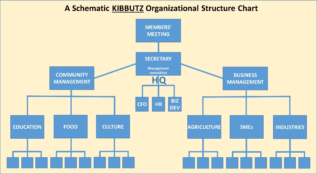 | The Kibbutz's purpose, values, and missions dictate its organizational structure and parts, which fundamentally differ from the decentralized model of a village and the centralized, hierarchical structure of a company. At the core of the Kibbutz is the Members' Meeting, which embodies the community's democratic and egalitarian principles. All members participate in decision-making, ensuring that the collective goals, mission, vision, and strategies align with the community's shared values and execution abilities. Operationally, the Kibbutz is managed by a secretary who oversees community and business management functions. Key roles like the CFO, HR, and Business Development within the headquarters (HQ) support this process. The Kibbutz is divided into community management, which is subdivided into various sectors, such as education, food, culture, construction and infrastructure, welfare, health, nursing, and gardening, and a business management section, which is subdivided into various sectors, such as agriculture, SMEs, and industries. Each sector has dedicated responsibilities but operates collaboratively rather than autonomously, reflecting the Kibbutz's emphasis on mutual support and collective success. The Kibbutz's vision, values, and mission are deeply embedded in its organizational structure and parts, which work in alignment and collaboration. Its egalitarian and cooperative ethos is mirrored in the participatory nature of the Members' Meeting, where each member's voice contributes to the decision-making process. This ensures a shared commitment to community welfare, social equality, and mutual aid guides the Kibbutz's direction. A unique feature of the Kibbutz model is the economic security it provides to its members, which enabled it to reach 0% poverty over a hundred years ago, still under the Ottoman and later the British Empires! Unlike the village model, where individual farmers must independently manage their economic viability, or the company model, where workers can be reassigned or relocated within the organization, the Kibbutz ensures that all members are supported collectively. If one sector of the Kibbutz faces difficulties, resources and labor are redistributed to support it, preventing any member from facing economic hardship alone. This is how the Kibbutz maintained zero (0) poverty over 100 years. This communal support system enhances the Kibbutz's resilience and provides a robust safety net for its members. The structure of the Kibbutz supports its vision and mission by fostering a strong sense of community and shared responsibility. The cooperative management of various sectors and the integration of community and business functions ensure that all activities are aligned with the collective good (not only that of the secretary). The emphasis on mutual aid and collective decision-making addresses challenges collaboratively and drives sustainable growth through the strength of communal effort. This alignment between vision, strategy, structure, and values creates a resilient and supportive environment, ensuring the well-being and prosperity of all Kibbutz members. THE KIBBUTZ OFFICIAL APPROACH This is a translated text of an official document of the Kibbutz movement from 2014, titled: Optimal organizational structure for an agricultural cooperative kibbutz. THE ROLE OF THE ORGANIZATIONAL STRUCTURE The goal: The organizational structure is a management tool that serves the vision, values, principles, and organizational culture of the Kibbutz and brings to light the fact that the members of the Kibbutz are sovereign in making decisions in their Kibbutz. Principles (in designing the Kibbutz organizational structure, N.I.): * The organizational structure should balance the Kibbutz members' participation and involvement in decision-making on the one hand and the creation of effective management mechanisms that have the authority and responsibility to decide and implement on the other. * The organizational structure must be in accordance with the Kibbutz's and cooperative societies' regulations. * The organizational structure, size, and cost should be compatible with the size of the Kibbutz, its social needs, and the scope of its businesses and corporations. * Each of the Kibbutz management teams and its corporations is part of an overall organizational system with common goals. They derive their authority from the body above them. This system is intended to clarify and regulate the relationship, subordination, and control between the various parts of the organization. * Areas of authority and responsibility must be determined for each position holder and administrative unit in the organizational structure design. The annual plan will also determine next year's goals, budget, and implementation schedule. INCOMPATIBILITY AND MISALIGNMENTS Organizations have a purpose, which they are expected to implement based on their values, vision, and mission. Organizations use a strategy to plan how to fulfill their purpose and a dedicated designed organizational structure to implement that strategy. Accordingly, the organization's structure and parts should reflect its strategy, which in turn (the strategy) reflects its values, vision, mission, and goals. Here is a summary of the three organizational structures, i.e., village, company, and Kibbutz, to discuss and determine to what extent each structure suits the organization's strategy and reflects its values, vision, mission, and goals. VILLAGE ORGANIZATIONAL STRUCTURE In developing countries, the village organizational structure often misaligns with the needs of smallholders. While village management focuses on providing essential services and infrastructure, smallholders' interests and focus are elsewhere, like acquiring access to funding and improved value and supply chains, which are services critical for their business success. The organizational structure of a village requires its farmers to have the means to manage the