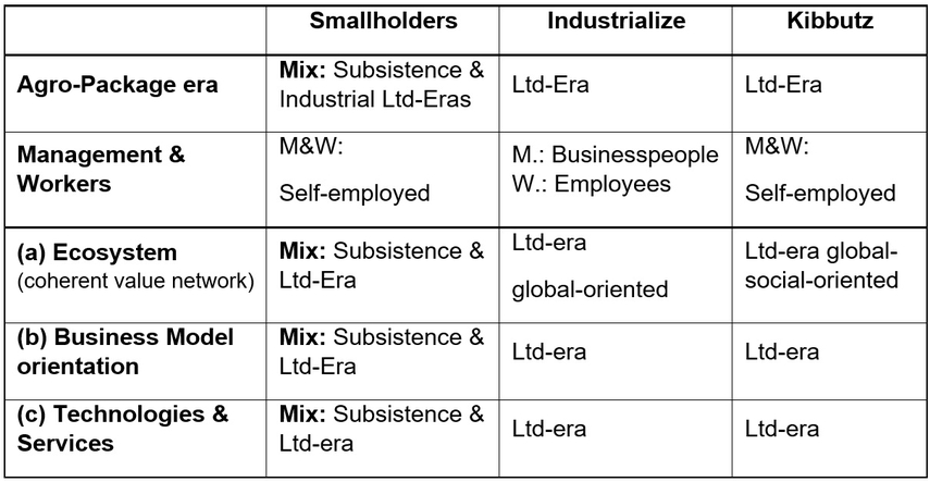 | Subsistence = The Agricultural Revolution era agricultural package. Ltd-era = The Industrial Ltd-era agricultural package. To fully grasp why technological innovations alone fail to alleviate farmers' poverty, it’s crucial to understand the implications of the table above: a prosperous and sustainable Agricultural Package depends on the cohesive alignment and integration of ALL its components, ensuring they remain competitive with the latest state-of-the-art advancements. Let me explain with an example. Consider a smallholder with 10 hectares of cotton, generating an annual income of $1,000. One day, this farmer receives an unexpected gift: a cotton-picking combine worth $500,000. This combine can harvest 100 hectares per day but comes with significant maintenance costs—$100 per day when idle and $1,000 per day when in use. Although the combine was a gift, can the farmer truly benefit from this advanced technology for his 10 hectares? Can he afford the maintenance costs? Does he have the skills and staff to operate such complex machinery? Moreover, does he have the logistical and marketing capabilities to utilize the combine on additional farms? And if he does, has he transitioned from being a small-scale farmer to becoming a service provider? The table reveals a reality often overlooked: smallholders operate within a mixed Agricultural Package. Their family, colleagues, and village are still rooted in the Agricultural Revolution era's ecosystems and business models. At the same time, the surrounding world speaks the language of the Industrial Ltd-era's ecosystems, business models, technologies/services. This blend of Agricultural Packages—combining elements from the Agricultural Revolution and the Industrial Ltd-era—inevitably leads to clashes, misalignments, and inefficiencies. The result is always predictable: advanced, cohesive packages consistently offer better livelihoods than those that rely on outdated or mismatched elements. Resisting this historical shift is as futile as trying to revert to a hunter-gatherer economy instead of modern agriculture. When we attempt to modernize an outdated agricultural package rooted in the Agricultural Revolution, such as those used by smallholders, by introducing advanced technologies like GMO seeds and fertilizers, we risk exacerbating existing mismatches and imbalances within the package's components, leading to potential failure. As demonstrated by the cotton combine example, farmers can only fully benefit from technologies and services when these elements are aligned with the other components of their agricultural package. This mismatch highlights why repeated efforts to introduce advanced technologies and services often fail. To create meaningful and lasting change, it is essential to simultaneously cope with and upgrade all components of an Agricultural Package. The Kibbutz model exemplifies this principle by seamlessly aligning and upgrading the entire Agricultural Package. It transforms the traditional village system, rooted in the Agricultural Revolution, into the innovative Kibbutz model. In this model, everyone collaborates like a modern company, community, or startup—fully committed to the organization's mission and aligned with the most advanced package of the Industrial Ltd-era. This cohesive and resilient foundation was pivotal in Israel's emergence as the “startup nation” it is today. SHIFTING THE PROSPERITY NEEDLE As we now understand, the prosperity of organizations and societies lies on a continuum—the Poverty-Prosperity Scale—where their position is determined by their degree of togetherness and integration on the Isolation-Togetherness scale. Isolation: Numerous programs aim to teach impoverished farmers self-reliance, promoting the idea that survival depends on independence and isolation. However, by encouraging them to embrace isolation, we inadvertently push them toward the lower end of the Isolation-Togetherness scale, trapping them in a cycle of poverty. Consider North Korea, which emphasizes self-reliance and isolation; has this led to increased prosperity? The answer is clear: Isolation—whether as a lone individual, like Robinson Crusoe, or as a nation like North Korea—does not lead to prosperity and, at best, leads to 'survival mode'. Togetherness: Instead, the key to prosperity lies in moving the needle towards togetherness. We can accelerate and enhance prosperity by fostering cooperation, collaboration, and integration among farmers and value chain partners, who collectively form the ecosystem of the desired package. The principle is simple: the more "together" we are, the faster and more effectively prosperity will manifest. Working together presents challenges, particularly in establishing the necessary organizational structures—such as cooperatives or Kibbutz models—but it also opens the door to introducing innovations and successfully utilizing existing advanced business models, technologies, and services that drive prosperity. Adopting organizational structures and models that foster togetherness, collaboration, cooperation, a sense of belonging, and integration paves the way for prosperity and happiness. With this insight, imagine you are tasked with increasing prosperity and happiness among smallholders. In the past, you might have turned to agrotech companies, believing that new tools or technological innovations would solve all problems, boost farmers' income, and enhance the national economy. However, the actual impact does not lie in "what type of technology" but in "how we enhance societal togetherness and integration” – the "how" precedes the "what". As professionals in this field, we are responsible for strategically steering our communities and organizations toward greater togetherness, thereby unlocking the full potential of prosperity and happiness. THE TOGETHER NEVER-ENDING JOURNEY I was born into the world of a Kibbutz, where farming was revered as the noblest of 
