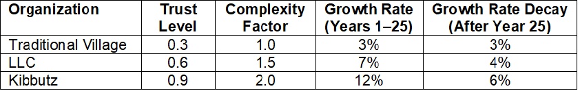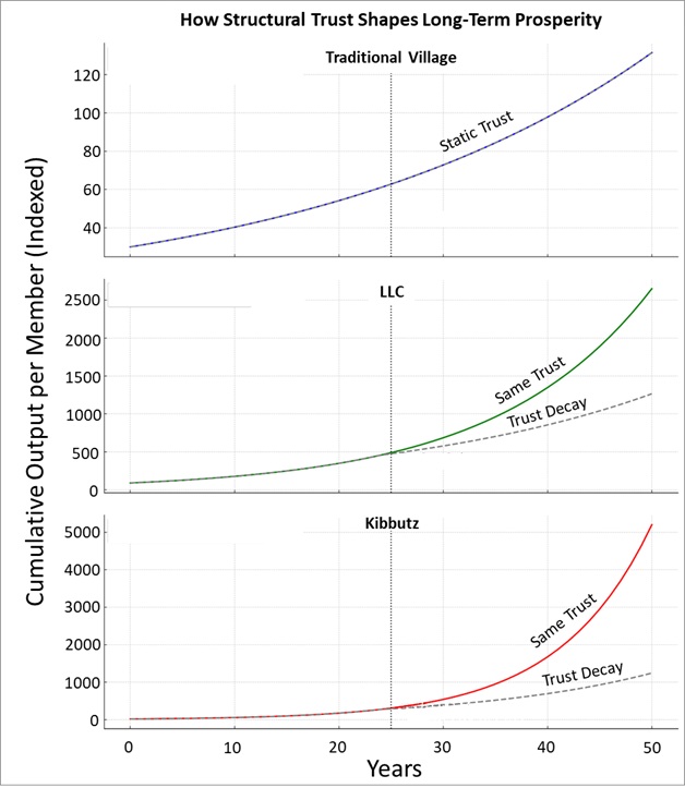 | | | Figure: How Structural Trust Shapes Long-Term Prosperity. This chart compares the long-term output of three organizational models, Traditional Village, LLC, and Kibbutz, under two scenarios: sustained trust and trust decay after year 25. The deeper and more enduring the trust, the greater the prosperity. Note: the Y-axis scale differs between charts. The lesson is clear: growth depends less on effort and more on the structure that trust makes possible. | | | Traditional Village. Visualization: Flat and steady path. With low structural trust and limited capacity to coordinate complexity, the Traditional Village grows slowly and predictably. Its structure remains static, and so does its trajectory. Limited interdependence produces modest but steady results, without the conditions for compounding growth or emergence. LLC. Visualization: A strong early curve, followed by a visible slowdown after year 25. The LLC benefits early on from clear roles, defined goals, and a shared mission. This structure supports coordinated growth, especially in the initial decades. However, when trust begins to erode, due to bureaucracy, fragmented incentives, or leadership turnover, its momentum slows. While it continues to outperform the Traditional Village, its long-term potential flattens as alignment weakens and coordination costs rise. Kibbutz. Visualization: Exponential early growth, then gradual slowdown. With the highest initial levels of trust and structural coherence, the Kibbutz achieves rapid early growth. Its deeply integrated design enables efficient coordination, low friction, and sustained alignment across all aspects of life. Yet, as seen in many real-world Kibbutzim, cultural shifts and weakening collective purpose begin to slow its trajectory after year 25. Even so, the strong foundation laid in its early decades continues to generate compounding advantages, yielding long-term gains that far surpass the other models.