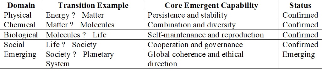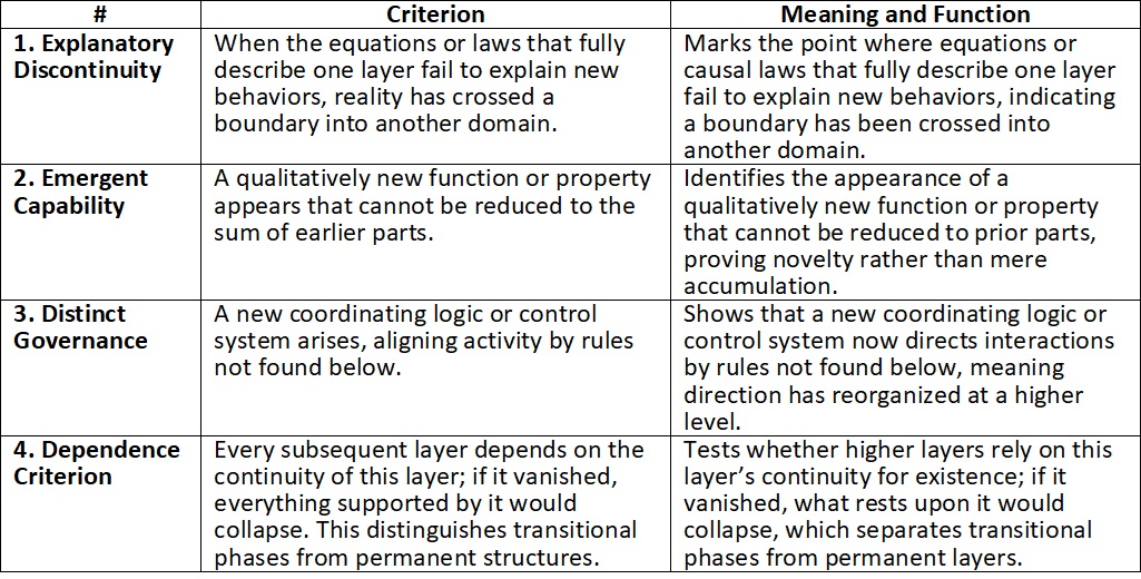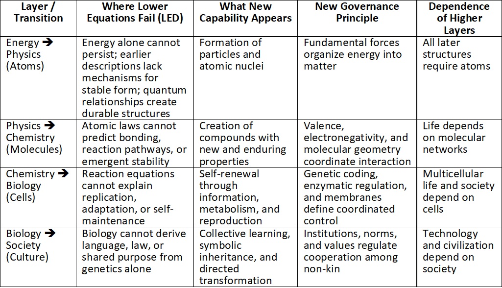 Part II. The Solution: A New Framework for Classifying Complexity Testing and Demonstrating the Framework on Known Layers Having established the diagnostic framework for identifying new layers of existence, we now apply it to the domains already well understood within science, physics, chemistry, biology, and society. Across these four realms, the universe advanced from energy to matter, from matter to molecules, from molecules to living systems, and from living systems to cooperative societies. Each transition reveals the same universal logic: when energy, structure, and direction reach a new alignment, a higher order of coherence emerges, producing a distinct layer of reality. These case studies serve as calibration points: they confirm that the criteria can detect real thresholds in the history of complexity, providing a stable reference for identifying new ones. To demonstrate how the framework functions in practice, we now apply the four Foundational Criteria, Explanatory Discontinuity, Emergent Capability, Distinct Governance, and Dependence, across the best-known transitions of scientific evolution: from physics to chemistry, from chemistry to biology, and from biology to society. A fifth clause summarizes how the ten Structural and Expressive Indicators confirm and stabilize each new domain once established. This process transforms the recognition of emergence from a philosophical intuition into a verifiable scientific procedure that can be consistently applied across all disciplines. - From Physics to Chemistry