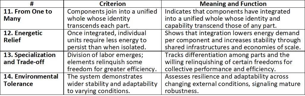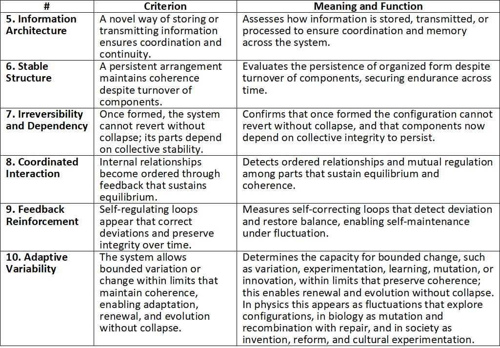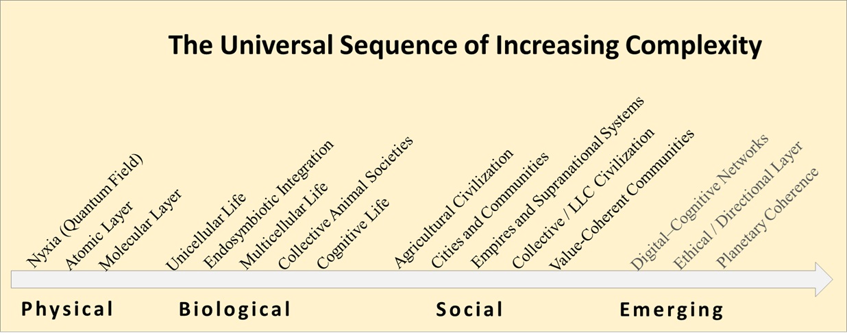 | Expressive traits reveal maturity and resilience. Their absence suggests youth or instability, not nonexistence. Weighting System: Each Foundational criterion has a weight of 3, each Structural criterion 2, and each Expressive criterion 1. A new layer typically scores at least 20 out of 29 weighted points (11 out of 14 raw). This ensures that emergence is evaluated based on foundational transformation and adaptive capacity rather than secondary elaboration. How the Dependence Criterion Refines the Test: The Dependence Criterion distinguishes phases from layers. A phase may display organization yet, if later realms can exist without it, the phase was transitional rather than permanent. Chemistry cannot exist without atoms, biology cannot exist without molecules, and society cannot exist without living organisms; each therefore constitutes an enduring layer. Universal Fields of Coherence: Some forces act across layers rather than forming new ones. In the physical universe this role belongs to gravity, which holds structures in relation and whose influence grows with mass. In the social universe the equivalent is values, which hold conscious agents in relation and whose influence grows with moral or institutional weight. Values therefore act as the gravitational field of meaning, a continuous directional force that maintains social coherence without constituting a separate layer of existence. As gravity binds matter, values bind meaning. These fields remind us that coherence depends not only on structural innovation but also on enduring forces of attraction linking the earliest physical order with the highest expressions of consciousness. Applying the Diagnostic Framework: 1. Confirm the four Foundational indicators. 2. Verify at least four Structural indicators, including Adaptive Variability. 3. Identify three or more Expressive indicators showing the layer’s functional coherence or maturity. 4. Assess dependence across layers to verify the layer’s permanence. 5. Finally, confirm the presence of a universal field, such as energy, information, or values (as in gravity), that acts as the integrative force maintaining coherence within and across layers of existence. Only when these conditions are met can we speak of a new layer of existence. The ULIC transforms what was once guided by intuition into a repeatable method grounded in measurable criteria.