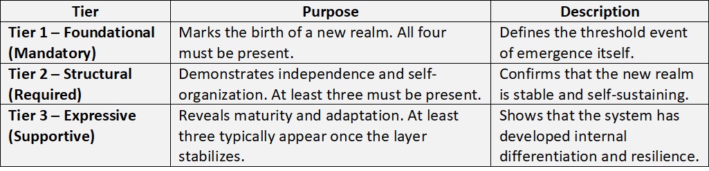 To determine when one layer of reality gives rise to another, we rely on the Law of Explanatory Discontinuity (LED), which forms the diagnostic core of the ULIC. It states that a new layer emerges when the equations, laws, or causal models that fully describe one domain no longer suffice to explain the next. Such failure of explanation is not a flaw in science but a signal from nature that a structural threshold has been crossed. Every great transition, from energy to matter, from matter to life, from life to thought, and from thought to consciousness, has been marked by such discontinuity. When the established language of description no longer works, emergence has already begun. Applied reflectively, the same law serves as a diagnostic mirror. By verifying that each recognized layer satisfies the same foundational, structural, and expressive criteria, we confirm both the framework’s reliability and its predictive capacity. Whenever new behaviors appear that invalidate earlier models, establish distinct governance, sustain coherence, and exhibit adaptive variability, we are witnessing the birth of a new layer of existence. The LED is therefore both descriptive and predictive. It illuminates not only how the universe has evolved but also where evolution is likely to proceed next. The Three Tiers of Emergence |