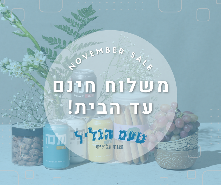 נובמבר סייל בחנות "טעם הגליל"! מתנות מקוריות ואיכותיות לימי הולדת, חג חנוכה, חג מולד, סוף שנה ועוד. מהיום ולמשך שבוע בלבד (עד ה-29.11) נחגוג נובמבר סייל בטעם הגליל ותהנו ממשלוח חינם לכל הזמנה מעל 120 ש"ח! לפרטים >>