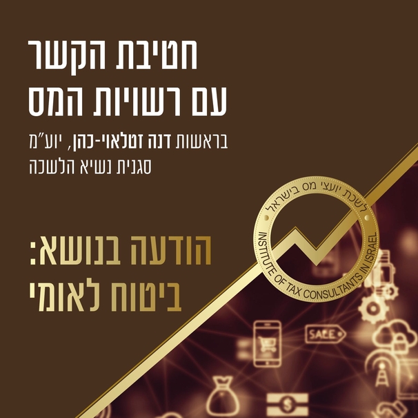 בברכה, דנה זטלאוי-כהן, יועצת מס סגנית נשיא לשכת יועצי המס ראש חטיבת הקשר עם רשויות המס רונית קולני, יועצת מס ממונת תחום ביטוח לאומי לשכת יועצי המס בישראל |