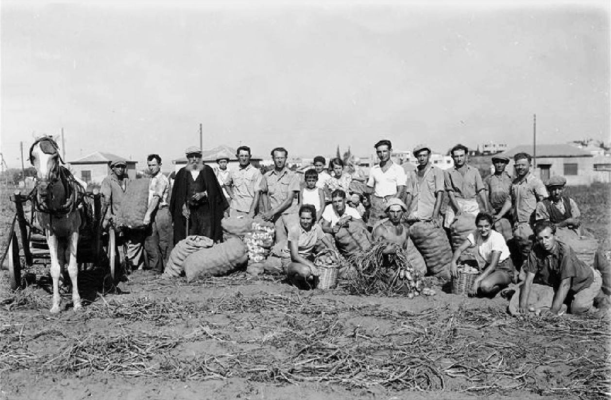 שנות ה-40: חקלאים במושבה כפר סבא חוגגים את חג השבועות.