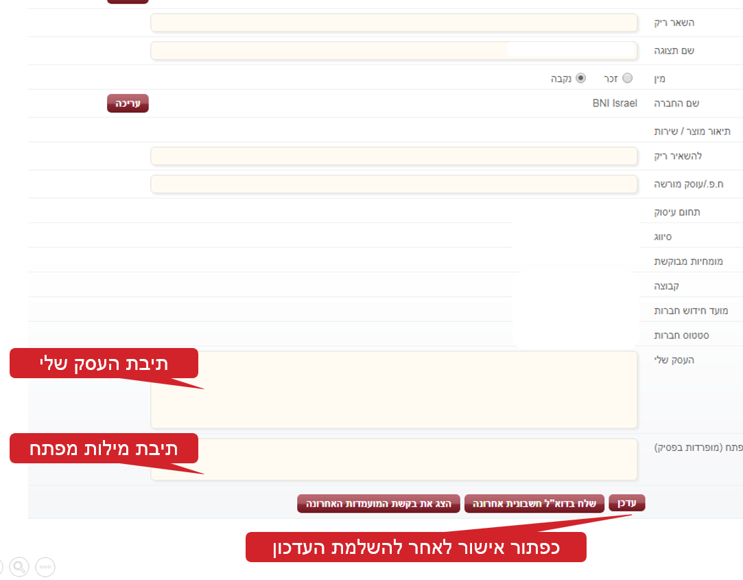 | תמונה עדכנית – האם התמונה מטושטשת, לא מעודכנת או חלילה שאינה מקצועית או בהקשר לא מקצועי (רקע לא ברור, בגד לא מכובד) תמונות שצולמו בחופשה, חשופות מדי או מוסתרות מדי ע"י כובע או משקפי שמש עלולות לגרום לאנשים לעבור לבעל מקצוע אחר. פרטי התקשרות – בדקו כתובת, טלפון נייח וטלפון נייד, יש לכם אתר? זכרתם להכניס את כתובתו? אם אין אתר ניתן להכניס את כתובת הפייסבוק/לינקדאין ודומיו לצרכי התקשרות. תחום מומחיות - לכל חבר אפשרות לפרט על תחום עיסוקו ובעיקר על תחום מומחיותו במלל חופשי. זוכרים את המצגת האישית שלכם? קחו את הנקודות העיקריות והעלו על הדף. בכפוף לאישור שהתקבל מועדת חברים. ככל שהדף האישי שלכם יראה יותר מושקע כך תראו יותר מקצוענים ואנשים ירצו ליצור עימכם קשר. זה כ"כ פשוט וקל, אז למה אתם מחכים? |
