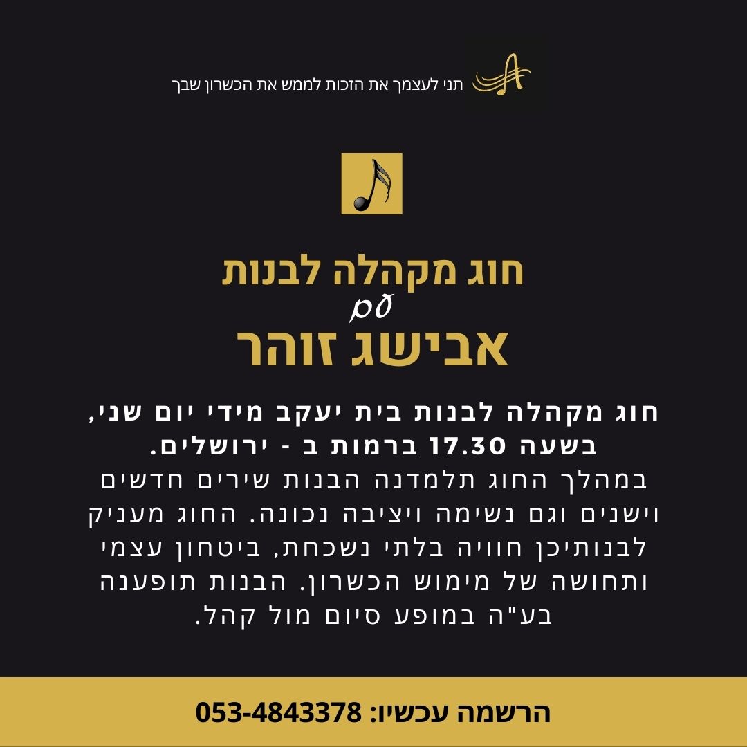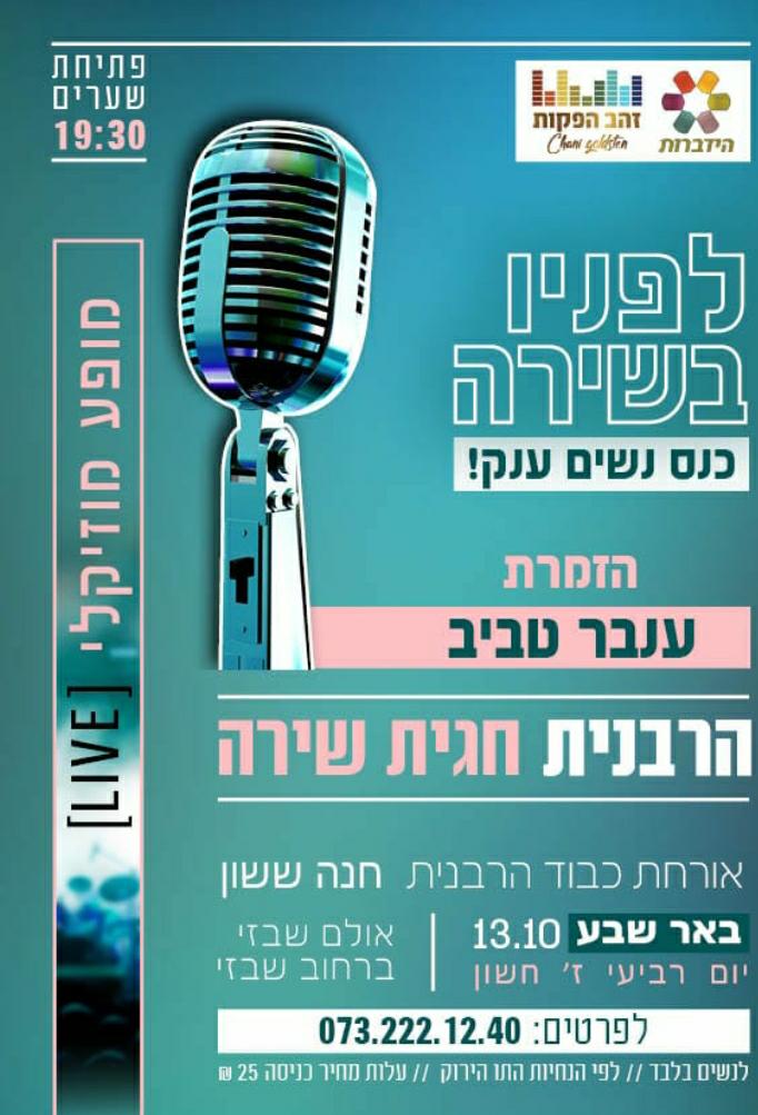 * לפניו בשירה- כנס נשים ענק עם הזמרת ענבר טביב והרבנית חגית שירה. באר שבע יום רביעי ז' חשוון, באולם שבזי, לפרטים: 073-2221240 מחיר כניסה 25 ש"ח. * נפתחה ההרשמה לשנת הלימודים תשפ"ב לבית הספר לאומנויות הבמה מבית עופר הלוי בניהולה של נועה גלאור, הלימודים הינם דו שנתייים. לפרטים והרשמה: Info@oferhalevi.co.il גברים- 052-9920099 נשים- 054-7926585. * לימודי פסיכודרמה בביה"ס מלכות, ההרשמה בעיצומה. לתיאום הגעה ליום הפתוח 054-8443264 038-050012 מייל: malhut1@walla.com * ביום שני, ה' בחשון 11.10.2021 יתקיים בירושלים בשכונת רמות, קורס עיצוב תכשיטי שיער לכלות ולארועים הקורס יהיה במפגש אחד. 4 שעות מלאות. לפרטים והרשמה: שלחי הודעה- נאוה גרינשטיין: 052-8396268