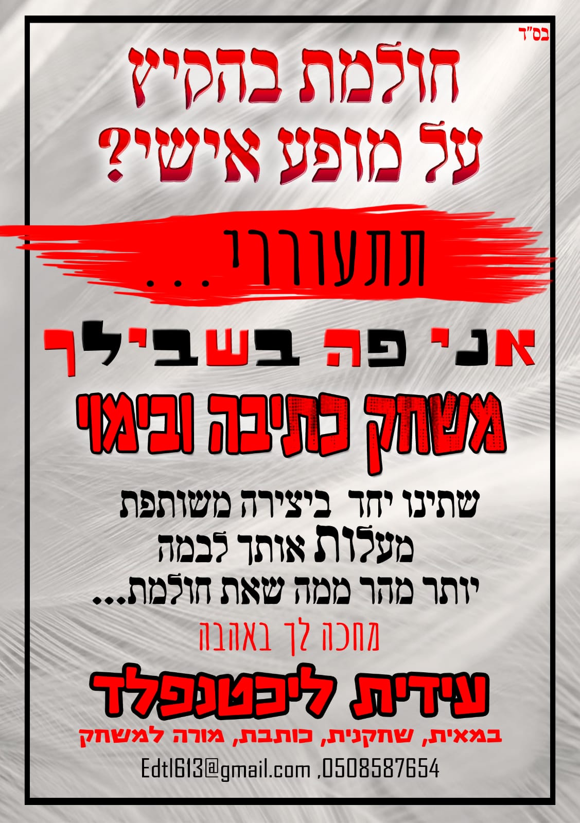 | | | * ועוד ד"ר נורית סירקיס בנק. נורית נהנית לה בסוכה עם שייק ירוק מתרד ולימון וג'ינג'ר שהיא הכינה. | | | * ענבר טביב בהופעה מהסוכה. | | | *השחקנית והשדרנית ציבי פרל מבלה בחול המועד סוכות בעמק הצבאים. | | | | * מזל טוב למשוררת שלנו אודליה אהלי שחגגה יום הולדת. איחולינו לעוד הרבה שנים יפות מלאות בעשיה ובאומנות. * מזל טוב לאמנית אלישבע אבר להולדת הבן צוות המגזין מאחל שתזכו לגדלו לתורה לחופה ולמעשים טובים. * מזל טוב לאמנית אסתי שאבו להולדת הבן אנו מאחלים לך רוב נחת ושמחה. * מזל טוב לדודה השחקנית והשדרנית ציבי פרל לרגל בר המצווה של אחיינה. | | | | * דרושה מורה שתלמד תאטרון בובות בי"ם ביום ד בערב. מ20:00עד22:00 נשים חרדיות במשך 20 מפגשים. השכר הוא 500ש"ח למפגש, ניתן ליצור קשר במייל malhut1@walla.com * אולפנת הבקעה בחמרה מחפשת מורה למוסיקה להובלת ההרכב הקולי וההרכב הכלי לאולפנה. תחילת עבודה מיידית. פרטים אצל שבות עמי 054-6603122. * לצוות הפקה מקצועי דרושה סאונדמנית- בוגרת לימודי סאונד, ידע בסיסי בתיקלוט, זריזה ועירנית. לטווח ארוך, מאזור המרכז, ניידת. לפרטים: 052-2495499. * דרושות מפעילות לשעות הצהרים בעיר לוד. אפשרות לתשלום בתלוש. שלחו ווטסאפ לטלפון : 058-3325026 העבודה להתחלה מיידית!! * עירייתראשוןלציון מבקשת בזה הצעות לתפקיד : מנהל תחום קהילה הדתית לאומית במנהל קהילה א. תאור התפקיד 1. אחריות לפיתוח הקהילה הדתית לאומית בעיר ,הכרת וגיבוש הקהילות השונות תוך יצירת קהילות חדשות מתושבי העיר ומתן מענה מותאם לצורכי הקהילות והיחידים במגזר. 2. בניית תוכנית פיתוח לקהילות הקיימות הדרכתן והכוונתם ועזרה בקליטה מיטבית של תושבים חדשים. 3. פיתוח המנהיגות הקהילתית והרבנית. 4. יצירת קשרי גומלין בין הקהילות שונות בעיר. 5. יצירת קשרי גומלין בין הקהילות לבין מערכת החינוך הממלכתי דתי. 6. הכוונה והדרכה פרטנית לתושבי העיר בתחומי הקהילה, החינוך, התרבות היהודית והדת . 7. הפקת וניהול אירועים קהילתיים . 8. בניית פלטפורמות מידע ייעודיות לציבור הדתי לאומי, ושיווק של פלטפורמות עירוניות קיימות. 9. סיוע בהפקת ובניהול אירועי המחלקה לתרבות יהודית. ב. דרישות סף 1. בוגר 12 שנות לימוד לפחות.2. ניסיון מיקצועי של שנתיים לפחות בארגון או בחינוך הבלתי פורמאלי, בהובלת פרויקט חברתי או חינוכי בקהילה.המועמד נדרש לצרף תיעוד מפורט להוכחת עמידתו בדרישות התפקיד. מועמד שלא יצרף תיעוד כאמור תיפסל מועמדותו על הסף. ג. כישורים נוספים 1. היכרות מעמיקה עם הקבוצות המרכיבות את הקהילה הדתית לאומית בארץ ,והבנה טובה של האופי הייחודי וצרכי הקהילה2. עבודה בקהילה הדתית לאומית או גרעין תורני – יתרון.3. מיומנויות חברתיות גבוהות.4. יכולת עבודה בצוות.5. תודעת שירות גבוהה.6. כושר ביטוי בכתב ובעל פה בשפה העברית ברמה גבוהה.7. תואר ראשון המוכר ע"י המל"ג - יתרון8. אוריינטציה מיחשובית ,שליטה בתוכנות office כולל אקסל, היכרות טובה עם רשתות חברתיות והשימוש בהן.9. נכונות לעבוד בשעות לא שגרתיות. להגשת מועמדות: https://www.jobbing.co.il/jtest1/linkgen?OI=134&FC=4929&RF=5 * פורום מוסדות תרבות ואמנות בישראל (ע"ר) דרוש/ה מנהל/ת הפורום (משרה חלקית) עמותת פורום מוסדות תרבות ואמנות בישראל המייצגת למעלה מ-150 מוסדות תרבות ציבוריים ונתמכים – תיאטרונים, תזמורות, מוזיאונים, להקות מחול, יוצרים עצמאיים ואיגודים בתחום התרבות והאמנות, הקימה ועדת לאיתור מנהל/ת לפורום. הגדרות התפקיד: - אחריות לניהולה השוטף של עמותת הפורום - עבודה מול מוסדות הפורום – האסיפה הכללית, הוועד המנהל והוועדות המקצועיות - עבודה מול יועצת הפורום לקשרי ממשל - ייצוג הפורום מול גופים ציבוריים, משרדי ממשלה, ארגונים שותפים וגופים נוספים - ניהול ואחריות לצד הכספי של העמותה בשיתוף וועדת הכספים של הפורום, כולל גיוס משאבים, טיפול בדמי חבר ותמיכות ציבוריות, עבודה מול רואה החשבון ומבקר הפנים של הפורום ועוד. - אחריות להפעלת התקשורת הדיגיטלית של הפורום: עדכונים שוטפים, ניהול אתר הפורום, רשתות חברתיות וכד'. - יי