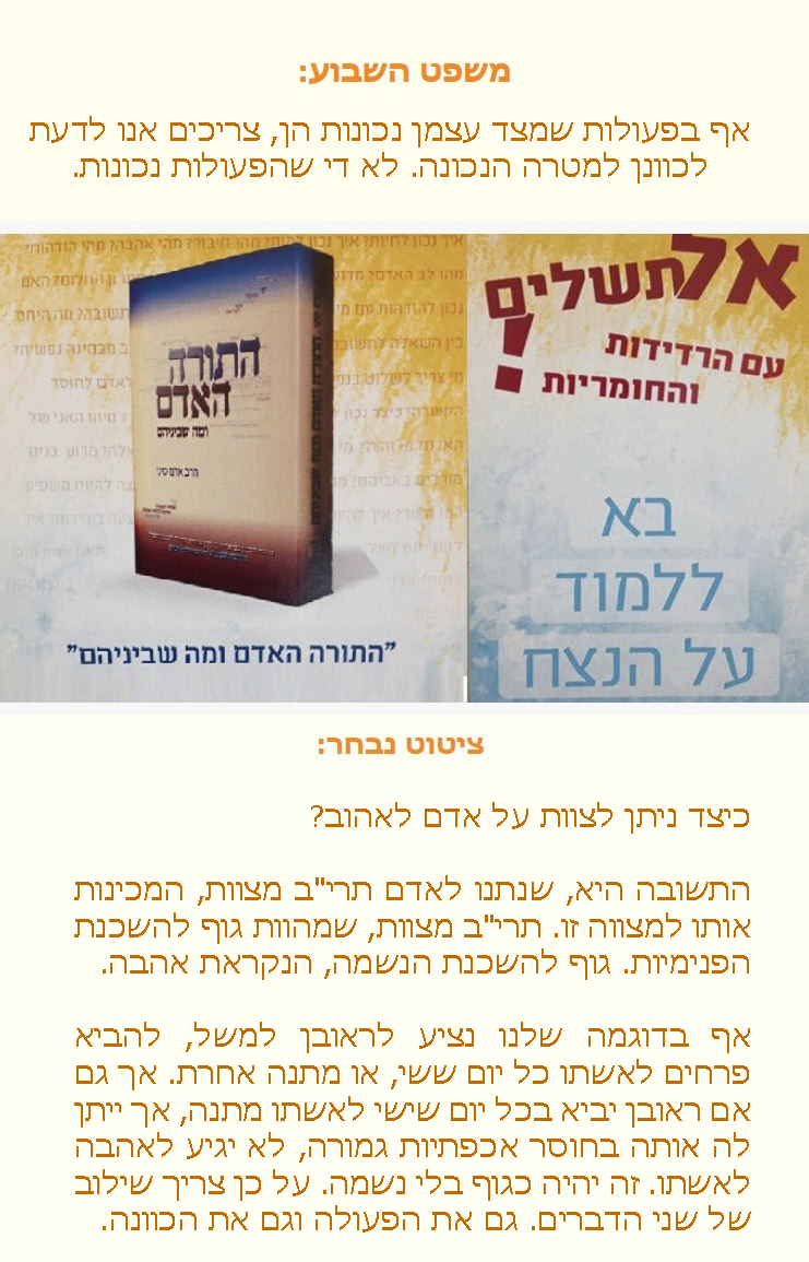 ״ובנות ירושלים יוצאות וחולות בכרמים״ – חולות הוא מלשון ״מחוללות״. במובן הפשוט נראות הן כרוקדות. הריקוד הנו אמנות המשתמשת בביטוי הגוף, כדי להביע רעיון מופשט. התנועה והמחול מלווים בד״כ בניגון, המחבר תנועה זו לנשמה. באופן הרגיל מכירים אנו את הריקוד כחיבור לניגון המתקבל באוזניים המייצגות את הנשמה, את מידת ההשפעה. בתזוזת הגוף, מתנגד הוא לעצלות הנובעת מיסוד העפר. העצלות מביאה לעצבות. הריקוד, בשונה מכך, מחבר לשמחה. השמחה האמיתית תהיה כאשר הריקוד יבטא ערך רוחני שלם – ערך אמוני. זוהי ההרמוניה אותה רוצות לבטא בנות ירושלים בבגדי הלבן ומשלימות הן תנועתן במחול, המייצר את הצורה הראויה להרגש הנשמה – להרגש הבחורים. מחול זה מציג גם את ההתבטאות הנשית לרצון לחיבור, מתוך העמדה של תפקיד הגוף, המבקש לבטא את הנשמה. כפי שהניגון הנו תנועת הנשמה, כך הריקוד הנו תנועת הגוף. השילוב בין תנועת הגוף לתנועת הנשמה מבטא זווג בין זכר לנקבה, בין הבריאה לבוראה. לא בכדִי לקחה ואף גנבה הסטרא אחרא את עניין הריקוד והמוסיקה כמוטיבים מרכזיים בתרבותה. “זֶה לְעֻמַּת זֶה עָשָׂה הָאֱלֹהִים״ (קהלת ז׳, י״ד). בהיותנו בגלות, איבד עולם הרוח את הקשר הרוחני ההרמוני בין המחול לניגון. מחול רוחני ישנו מחול רוחני אותו נלמד בע״ה ממשיח צדקנו. הוא ילמדנו את התנועות המתאימות והראויות לגילוי הניגון האלוקי. העולם קרוב יותר לגלות את הניגון הנכון, מטרם גילוי הריקוד הנכון. בחסידות, בה מבקשים שגם המלכות, דהיינו צד הנקבה, תהיה חלק מהתנועה הרוחנית, ישנו מקום חשוב לריקוד החסידים וכל שכן לניגון החסידי. בע״ה ילך ויעצים מחול הכרמים בבנות ישראל והשראה רוחנית תהיה מנת חלקנו, כך שיהווה הוא אחד מביטויי הגאולה השלמה. לב האדם מבטא את גופו הרוחני. ישנם אנשים העצורים בצורת הרגשה אחת, שאינם משוחררים דיים לבטא הרמוניה של רגשות בתוכם. השילוב בין קירבה לריחוק, בין תנועה מעגלית המבקשת את הרכות, לבין התנועה החדה המבקשת את הבהירות השכלית, יכול להתחבר ע״י הדגשת התכלית בב׳ צורותיה. חיבור ב׳ הצורות, הנקראות יראה ואהבה, מופיע בשלל צבעים ושלל רגשות הנובעים מאלו השניים. הרגשות המבטאים את חדות האמת, עוצרים את האדם מאותה גמישות רגשית המאפשרת את החופש הראוי לריקוד הרוחני. נדמה לכאורה, שצריכה האמת לבטא דבר שלם. אין הדבר כך, היות ונדרשת הכנה ראויה מצד הרגש לקבל אמת זו. כהשלכה בעולם הגשמי, יכולים אנו לראות את אותם אנשים שכליים, מדוייקים משהו, העצורים בכל גופם ולעיתים אף את עצמם אינם מרגישים. לעומתם ישנם אלו המתפרקים לרגשות רבים, ללא הרמוניה, מבטאים הם לכאורה חופש, אך אין זו אלא הפקרות לשמה. היכולת לשלב בין התנועה הקווית לתנועה המעגלית, בין אותה אמת רוחנית ליכולת להכילה מתוך אהבה ושותפות, היא הריקוד האמיתי. מתוך הספר מועדי ישראל האדם ומה שביניהם / הרב אדם סיני ניתן להזמין את הספר בטלפון : 050-314-1111 | 050-3143417 או בלינק למטה. {פוסט הרב משנים קודמות} |