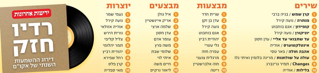 | | ברוכות הבאות וברוכים הבאים ל"מעניין לי ת'אוזן #4", הניוזלטר של מכללת ON AIR ובו כל הדברים המעניינים שהגיעו אלי ושקשורים לדברים שעוברים לנו דרך האזניים. | | נתחיל: בצעד היסטורי, תאגיד השידור שינה את מבנה מהדורות חדשות הרדיו שלו ואת האופן שבו הן נשמעות. מעתה המהדורה מתחילה חצי דקה לפני השעה העגולה, משובצים בה אינסרטים (כלומר קטעי ראיונות בקולם של המרואיינים/ות), ומוסיקה, שמנגנת התזמורת הפילהרמונית של ירושלים, מושמעת מתחת לכולה. כתבה של "כאן" על אודות המהלך תמצאו כאן ואם אתן/ם מתעניינות בתחום, שימעו את הפודקאסט הזה שהפקתי לפני כשנתיים עם בוגרות ובוגרים שלי ובו אנחנו מספרות/ים על ההסטוריה של אותות החדשות במדיה הישראלית מלפני קום המדינה ועד למהלך האחרון של התאגיד, לומדות/ים איך סאונד עובד עלינו באופן תת הכרתי, על המניפולציות שחברות החדשות מפעילות עלינו, על סאונד שמלווה אותנו מעל 100 שנה ועוד. בפודקאסט, שנלמד באוניברסיטאות ברחבי הארץ, מתארחים בין השאר ארז טל, יעקב אילון, יזהר אשדות ועוד רבים וטובים. הנה "החדשות של ישראל" חלק א' (18 דקות) וחלק ב' (19 דקות). | | | אולפן החדשות של רשת ב'. צילום מסך מכתבה של "כאן 11" רז שכניק קיבל מאקו"ם, באופן בלעדי לידיעות אחרונות, את רשימת היצירות המושמעות ביותר ברדיו לשנת תשפ"ג. הנה התוצאות: