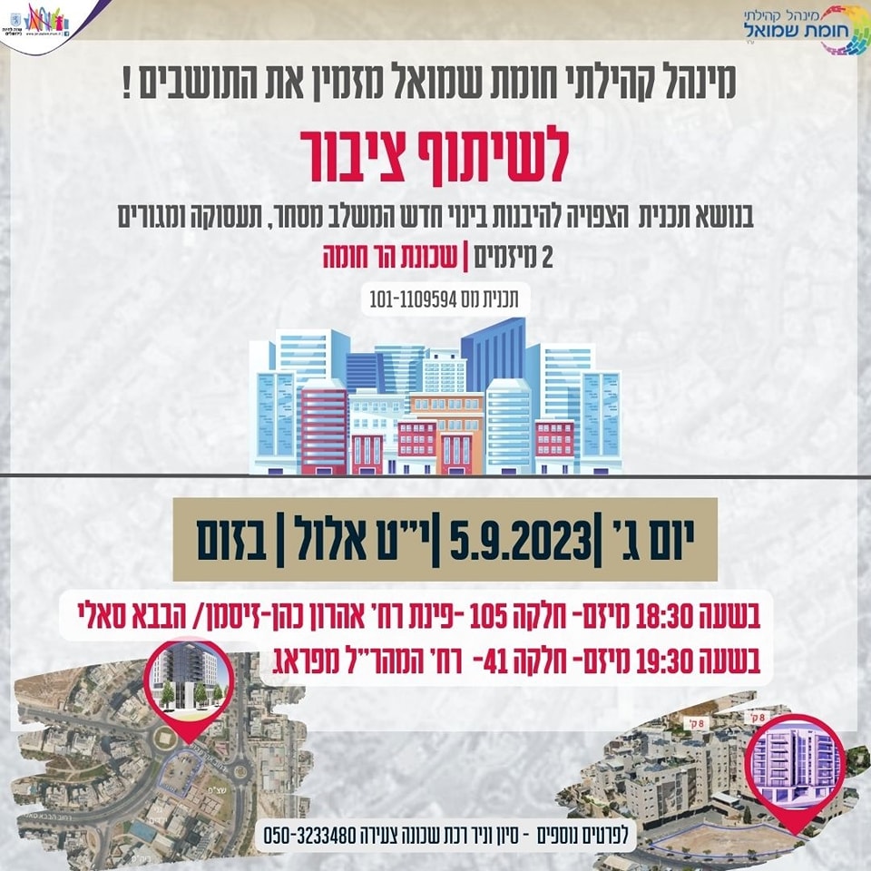 | מינהל קהילתי חומת שמואל מזמין את כלל תושבי הר חומה לשיתוף ציבור יום ג|5.9 |יט אלול בנושא תוכניות הצפויות להיבנות, בינוי חדש המשלב מסחר, תעסוקה ומגורים. חשיפה והצגת תוכניות, ע"י היזם והאדריכל המובילים של המיזם. שיח פתוח ושאלות בנושא המיזמים. המפגשים יערכו בזום. יישלחו לינקים מסודרים לזום בהמשך. מחכים לכם! |