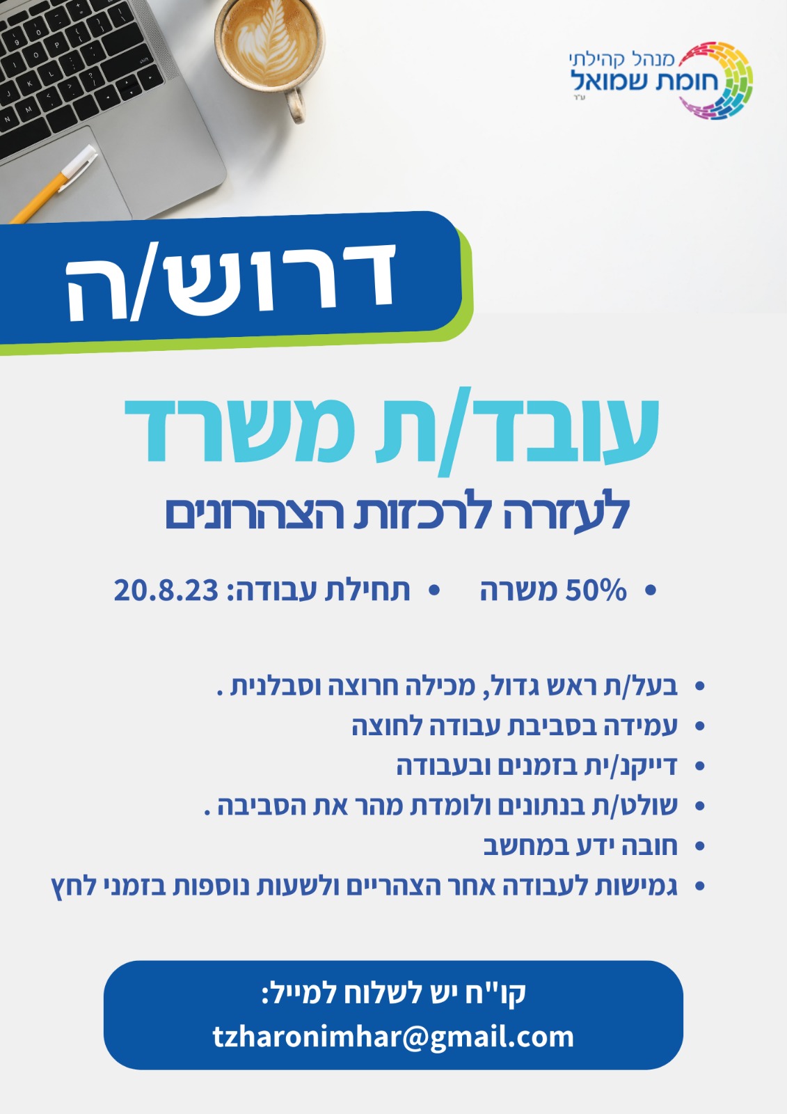 | תחום הגיל השלישי במנהל הקהילתי - חומת שמואל, מעוניין לאתר ולגייס תושבים אשר עסקו או עוסקים בהעברת קורסים במתכונת סמסטריאלית, שנתית ומוכנים להרתם ולהשתלב במיזם הלימודים ולהעניק מניסיונם ומכישרונם לבני 60+. מודים לכל מי שמגלה נכונות להשתלב במיזם וגם לאלו שיעבירו לנו פרטים על תושבי השכונה אשר מתאימים למיזם ואנו ניצור עימם קשר. לפרטים- אברהם- 0542888445 ליאורה- 0542407205 |