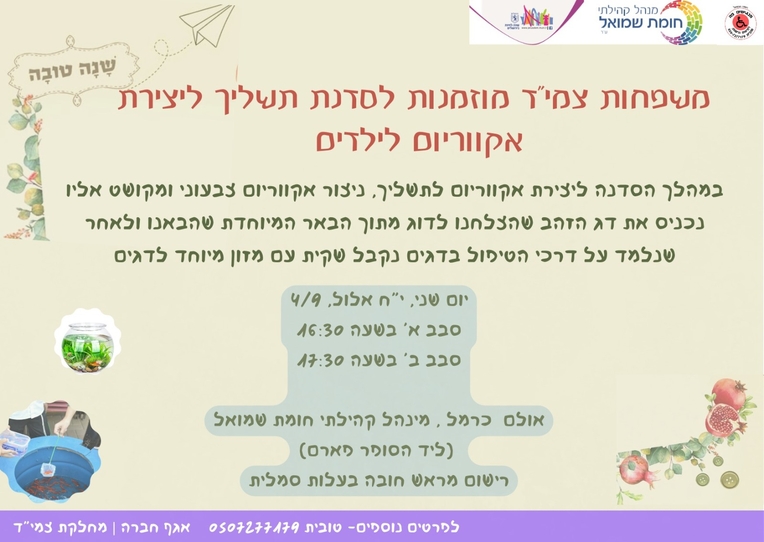 | משפחות יקרות! מוזמנות לסדנה חוויתית לקראת ראש השנה. בסדנה נלמד על מנהג "התשליך" בדרך מיוחדת בה כל ילד יכין ויקשט לו אקווריום ולבסוף ידוג לו דג. הפעילות תתקיים בשני סבבים. מס' מקומות מוגבל. מהרו להירשם. קישור לרישום לסדנת תשליך |