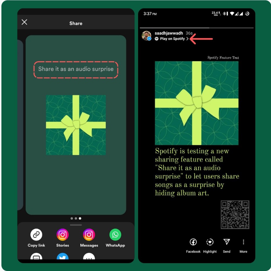 ועוד ספוטיפיי: בקרוב היא תאפשר למנוייה/ותיה לשלוח לחברות/ים "הפתעות מוסיקליות". נחמד יהיה לפתוח נוטיפיקיישן שאומר "רציתי שתדע/י שאני...", ללחוץ Play ולשמוע את "Thinking of you" של The colourfield. פחות נעים יהיה לקרוא "לא יכולה לומר לך את זה בעל פה, אז תקשיב לשיר", ללחוץ על קובץ לא מזוהה ולשמוע את "אוהבת אותך עוזבת אותך" של דפנה ארמוני.