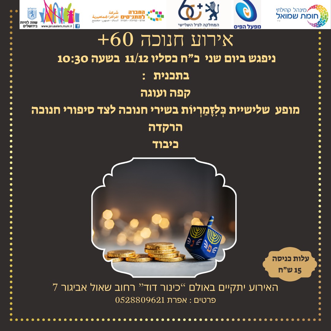 | קהילה יקרה מוזמנים לאירוע חנוכה 60+ שיערך באולם "כינור דוד", ההרקדה מיועדת לנשים ,רישום ותשלום דמי כניסה 15 ש"ח בקישור- https://did.li/E5bgT |