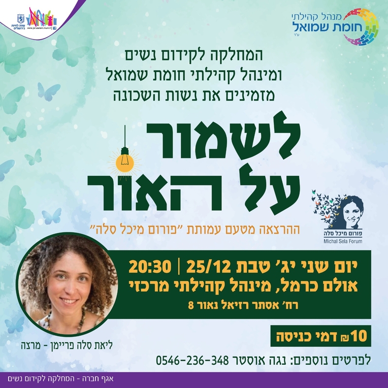 | נשים יקרות מוזמנות להרצאה מטעם עמותת "פורום מיכל סלה" עם ליאת סלה פריימן, אחותה של מיכל סלה ז"ל. ההרצאה תתקיים ביום שני י"ג טבת 25/12 בשעה 20:30, מינהל מרכזי. להרשמה- https://bit.ly/3GlWElo |