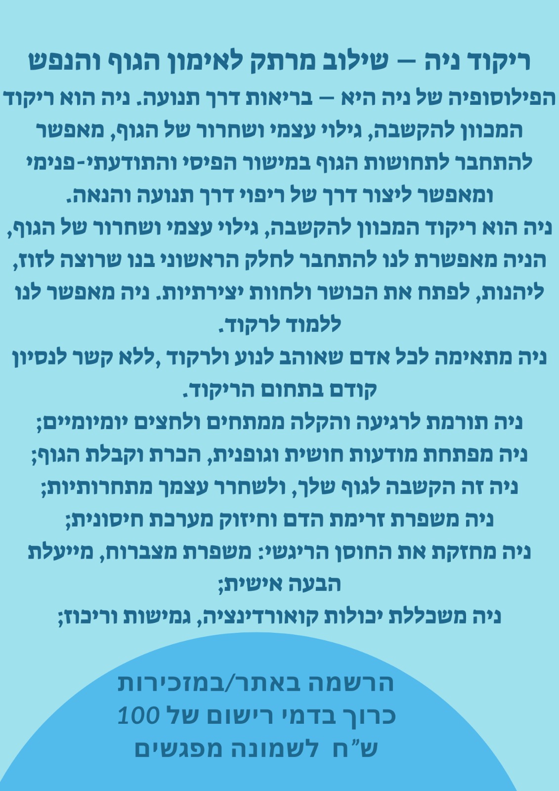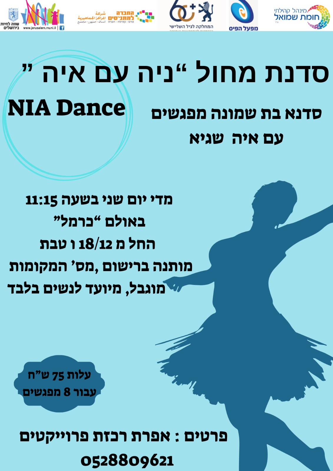 | סדנת מחול עם איה מורה מוסמכת שמעבירה סדנאות כ 12 שנה, לא נדרש ניסיון קודם. החל מו' טבת 18/12, מס' המקומות מוגבל יש להרשם בהקדם. הסדנא באולם כרמל במבנה המרכזי |