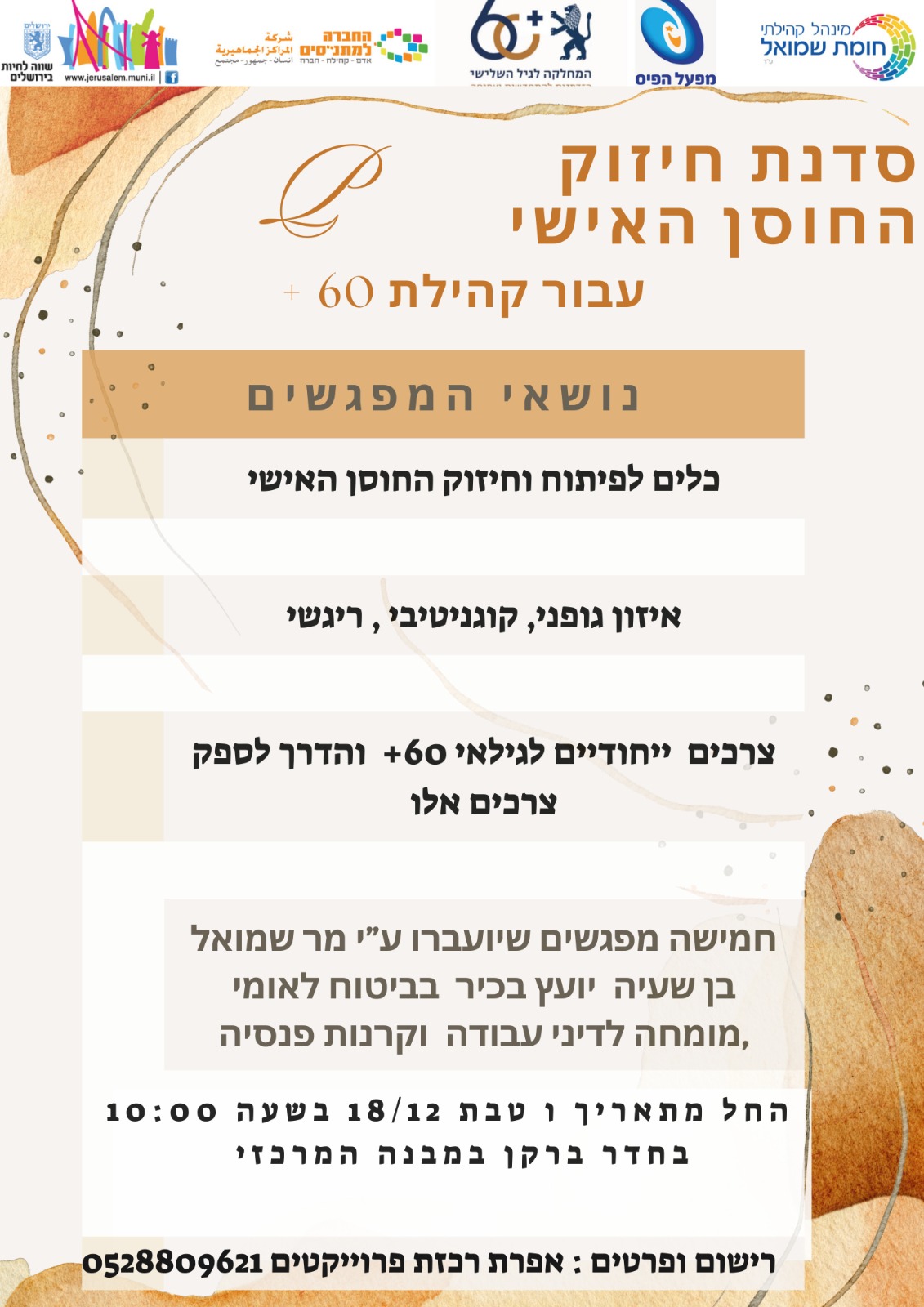 | סדנת חיזוק החוסן האישי, סדנה ייחודית עם שמואל בן שעיה. החל מו' טבת 18/12 בחדר ברקן במבנה המרכזי, הסדנא ללא עלות, אך כרוכה ברישום. בואו בשמחה! |