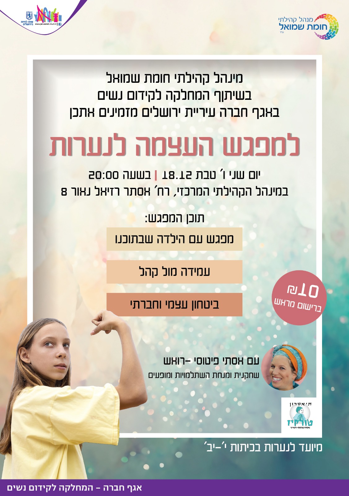 | נערות יקרות, מוזמנות למפגש העצמה שתעביר אסתי פיטוסי רואש. בואו לקבל חיזוק לביטחון העצמי ולמי שאתן! במפגש יהיו תרגילי תאטרון ושיח על סקרנות,שיחרור, חיבור ל"כאן ועכשיו",צחוק, שמחה... לא לשחקניות בלבד