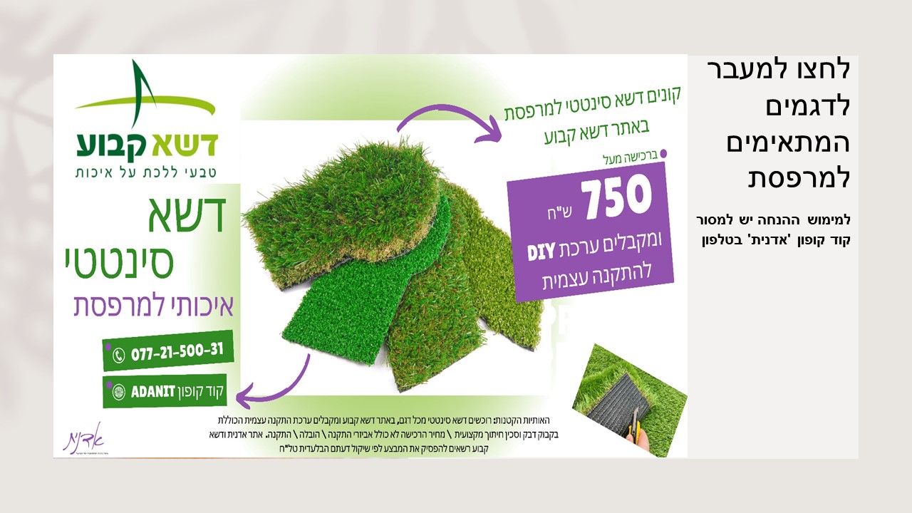 הטבה שניה - הנחה על דשא סינטטי למרפסת. לחיצה על תמונה מס' 2 למטה תעביר אתכם לחברת 'דשא קבוע' ממוקד לדגמי מדשאות יעודיות למרפסות.