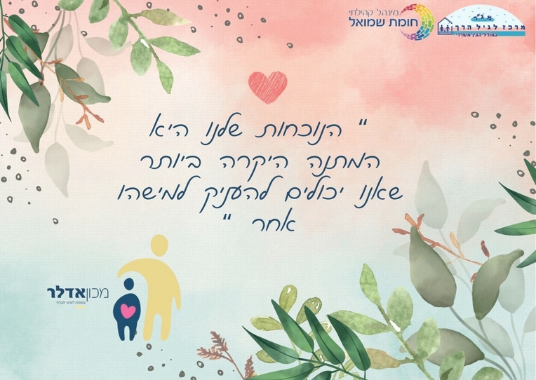 | קבוצת הנחיית הורים בגישת אדלר חדשה נפתחה השבוע במרכז לגיל הרך מינהל קהילתי חומת שמואל - זמן לשוחח, לקבל כלים, להתייעץ ולהעשיר את הידע. תודה לשמרית אלטלט מדריכת ההורים המדהימה שמלווה את הורי השכונה כבר תקופה ארוכה. |