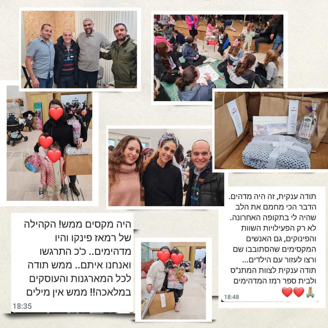 | ואוו איזה אירוע היה לנו בחמישי למשפחות המגוייסים התרגשנו כל כך. צוות משפחות המגוייסים במינהל יצר קשר עם בית הספר רמאז ניו יורק שהחליטו להביא למינהל בתרומה, הפנינג למשפחות וילדי מילואים "ללביאות חומת שמואל"! הם הגיעו עם כל כך הרבה רצון לתת ולשמח והמשפחות פשוט קרנו מאושר ונהנו כל כך! ההפנינג היה מלא בפינוקים למשפחות- דוכני אוכל, פופקורן ושערות סבתא, מופע גאגלינג מטריף ומתנות שוות לכל משפחה תודה לכל מי שלקחו חלק באירוע המדהים הזה️ אם בן/בת זוגך מגוייסים- יש קבוצה ייעודית מוזמנים להיכנס https://chat.whatsapp.com/DgExnYmmDlm8kD5fWq9xNI |