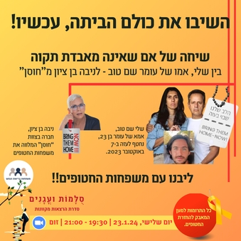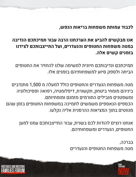 | ויש לזה המשך... לתמוך ולהודות הועד המנהל של 'משפחות בריאות הנפש' החליט לתרום למטה משפחות החטופים את כל התרומות שהתקבלו מכם בעקבות מפגש מרגש זה. אנחנו משתפים את מכתב התודה שהתקבל בעקבות מהלך זה שמיועד גם לכם ושהובילו אותו מיכל רמון ואתי דהן. שוב, תודה. עד שכולם יחזרו הביתה! |