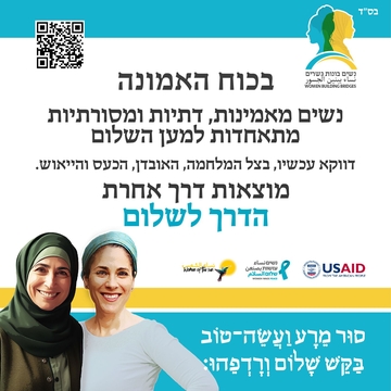 | נשים מאמינות, דתיות ומסורתיות, משפיעות בקהילותיכן מכל הקשת הדתית והפוליטית - הצטרפו אלינו לתוכנית הכשרה ייחודית, המיועדת לישראליות ופלסטיניות: מסע משותף של למידה, היכרות ודיאלוג. יחד נגלה את הכוח הטמון באמונה, כאשר היא מוכוונת לשלום ולשיתוף פעולה; נמצא את המשותף בינינו ונתחזק כקהילה של נשים מאמינות, דתיות ומסורתיות שמעוניינות בעתיד אחר לילדינו. | | | | |