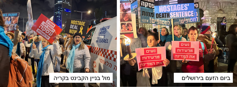 | נשים עושות שלום ממשיכות לתמוך במשפחות החטופים ולקרוא לשחרור החטופים כולם-וכולן, עכשיו!! זה קורה - - - >> במשמרות בכיכר החטופים ברחבת המוזיאון בתל אביב יום יום אחר הצהריים כבר 145 יום; >> בצמתים במרכזי הערים; >> במחאת הנשים ביום הזעם בירושלים, בצעדה ממוזיאון ישראל עד מאהל המשפחות מול מעון ראש הממשלה בבלפור בירושלים; בקריאות מחאה: סירוב לעסקה= גזר דין מוות! >> מול בניין הקבינט בקריה בקריאה "תשלחו נציגות לקהיר, אין לנו הזדמנויות לפספס! את כולם ! עכשיו!" >> בכנס ביטחון באקספו תל אביב, שאורגן על ידי משפחות החטופות והחטופים. דנו בו בשאלות הנוגעות להחזרתם-כולם ול"יום שאחרי". זאת - במעמד נשיא המדינה ושר הביטחון ובהשתתפות מומחי ומומחיות ביטחון של מדינת ישראל לדורותיה. |