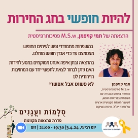 | "להיות חופשי בחג החירות" רשמים מהרצאתה של תמי קויפמן נושא החופש קשור לכל אדם, אך תמי מביאה את הנושא מהזווית של משפחות שיש בהן מתמודדי נפש וציינה: המסע אל החירות של משפחות המתמודדים לא פשוט אבל אפשרי. לשם כך, לדבריה, אנו צריכים להבין מהי חירות, היכן אנו רוצים אותה ומדוע אנו מוותרים עליה פעמים רבות. הבחירה לוותר על השעבוד ולצאת לחופשי מצריכה אומץ, כי אנו לא יודעים מה מחכה לנו בצד השני. אנחנו צריכים להסכים להיות בחוסר ודאות לפעמים אנו מוכנים לעשות את התנועה ולהתחיל שינוי רק כשהשעבוד הפנימי והחיצוני הופכים להיות בלתי נסבלים. רק אז אנו מוכנים לתת לגיטימציה לצרכים ולקול הפנימי שלנו, ולהתחיל לעשות צעדים (לא די במילים ומחשבות) כדי להיות בן חורין.... |