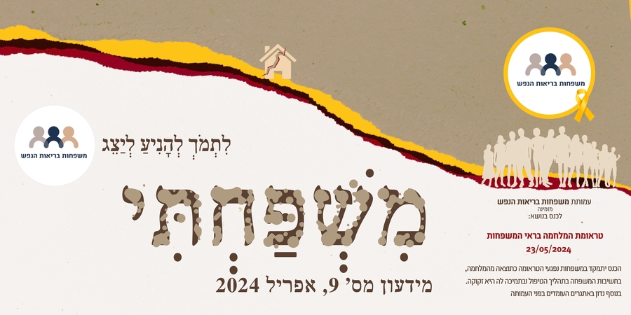| רק כמה מילים לפני שמתחילים... נרגשים וגאים לקראת הכנס שלנו בנושא "טראומת המלחמה בראי המשפחות" נושאים על דגלנו את המשימה לתת למשפחות את התוקף וההכרה בחשיבותה שאין לה תחליף בבריאות הנפש. נכון, המכתב ה'משפחתי' שלנו, עמוס, כך גם העשיה שופעת. ואתם בני המשפחות והסביבה התומכת - בראש מעיינינו תודה שאתם איתנו, מערכת ה'משפחתי' |