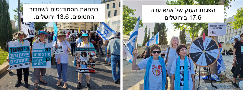 | חזרתם ארצה החודש של נועה, אלמוג, אנדריי ושלומי מילאה את כולנו אושר. בד בבד, דאב ליבנו על נפילתו של ארנון זמורה ז"ל וגם על פלסטינים חפים מפשע, חלקם נשים וילדים ששילמו בחייהם. מעגל הדמים ממשיך. רק עסקה לשחרור כל החטופים וסיום של המלחמה יחזירו את כל החטופים למשפחותיהם, ישימו קץ למעגל הדמים הנוראי ויאפשרו בניית מהלך מדיני-אזורי למען חיים בטוחים לכולם. לכן המשכנו החודש, כל יום, לתמוך במשפחות החטופים בשער בגין בתל אביב. יקיריהם נמצאים כבר 267 ימים ולילות בגיהנום של עזה ואנו זועקות עם המשפחות עסקה עכשיו. |